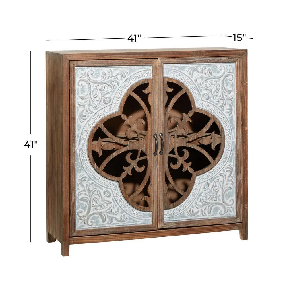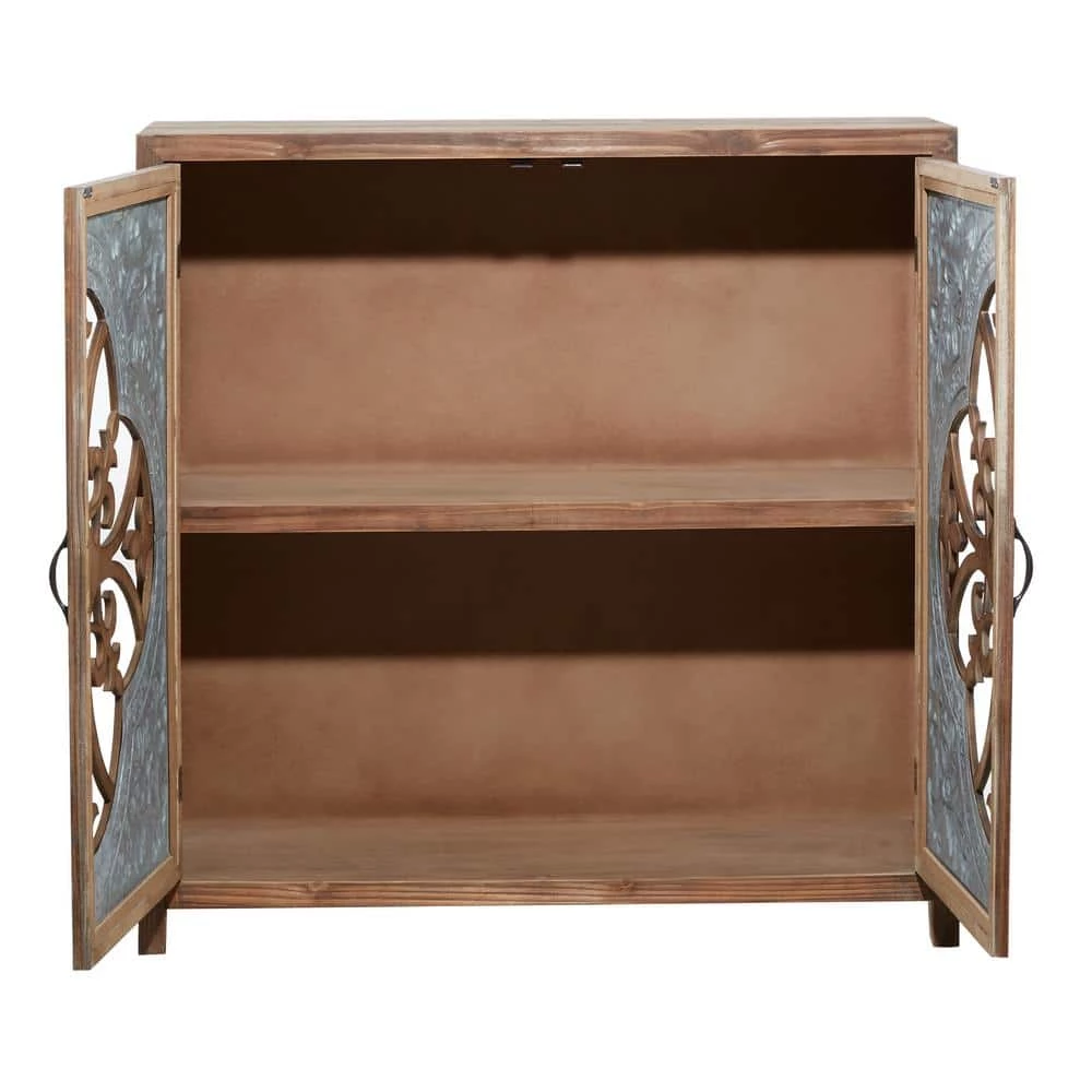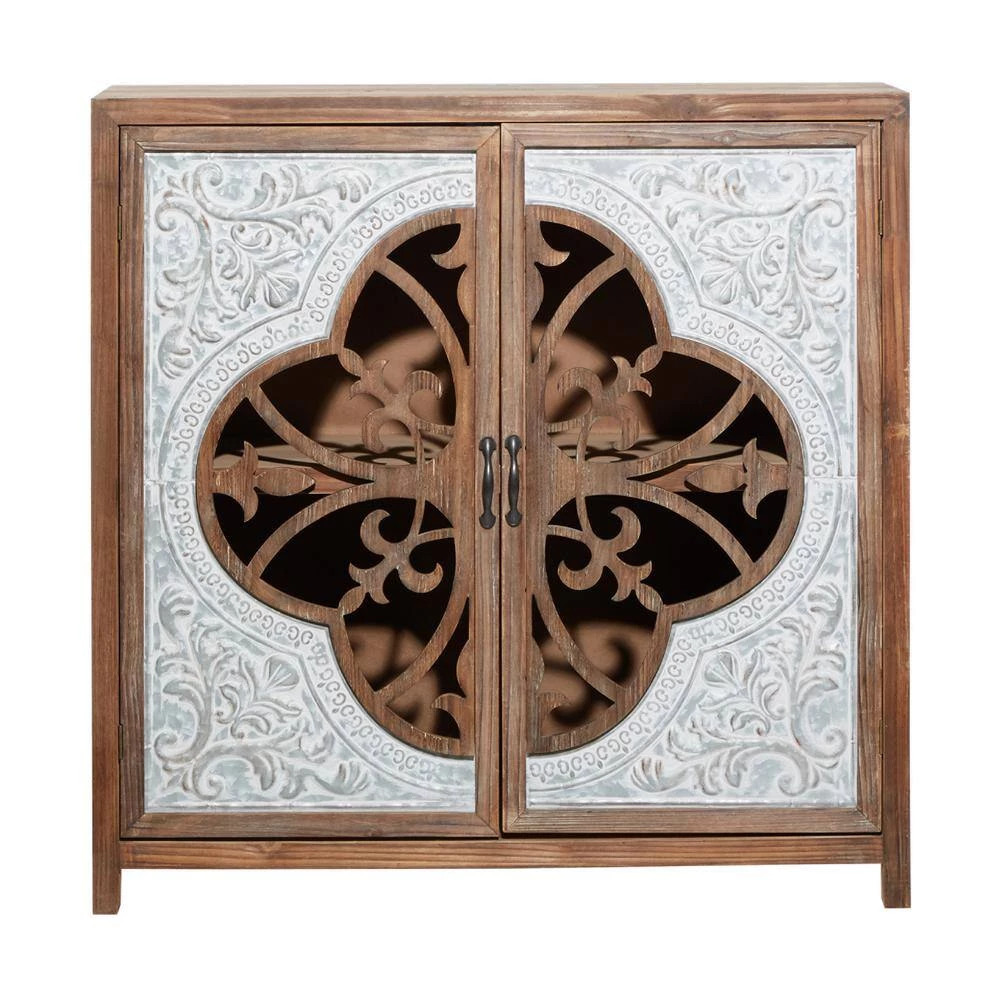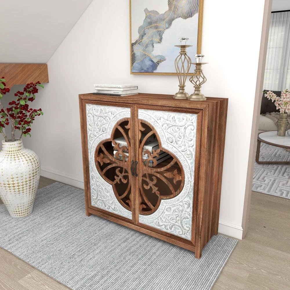 Useful and elegant, cabinets are more than just a place to store clutter and place a lamp. Add a unique stylish storage to your living room, hallway, or bedroom with this cabinet. Includes a wide table top for your vases, home decors, and embellishments. The inside of the cabinet has a huge space for items like books and magazines. A brown rectangular cabinet with 2 carved wooden doors and metal handles. This item comes shipped in 1 carton. Suitable for indoor use only. Maximum weight limit is 100 lbs. This accent furniture features inner shelves for more storage. Farmhouse-themed style.