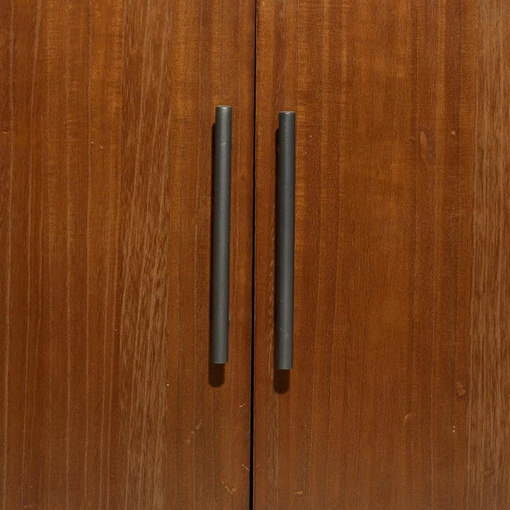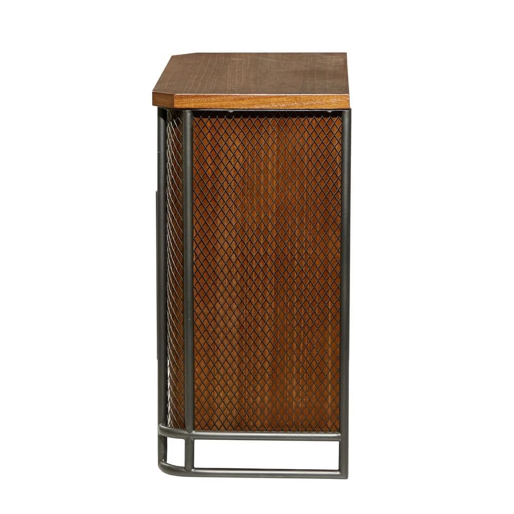 - Wooden cabinet is bordered with lattice patterned metal frame and installed with metal handles