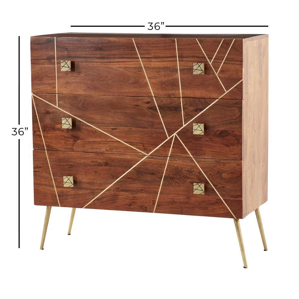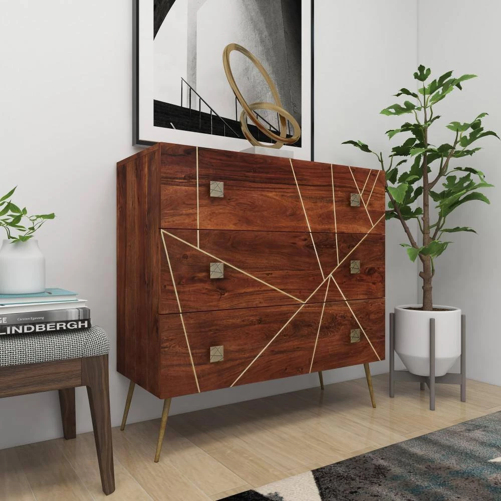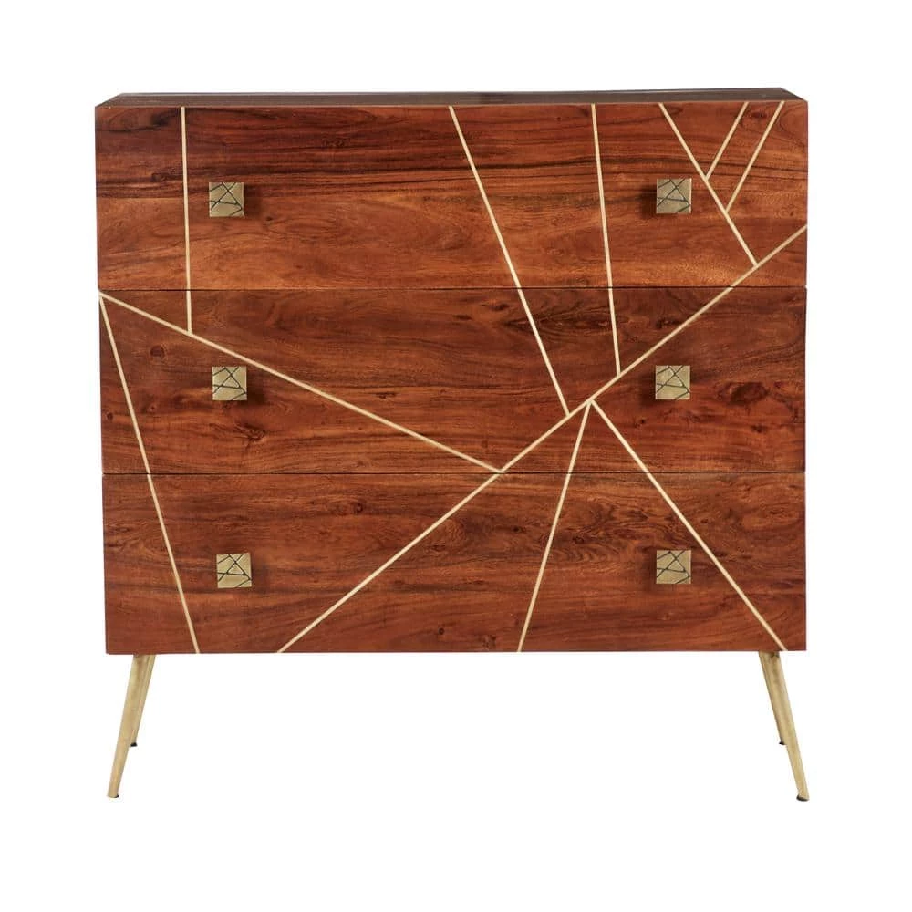 Wood and brass-like metal finish match with modern and art deco concepts. Useful and elegant, cabinets are more than just a place to store clutter and place a lamp. Add a unique stylish storage to your living room, hallway, or bedroom with this cabinet. This item comes with mounting hardware to prevent tipping. Designed with stoppers at the base that prevent scratching furniture and table tops, as well as sliding around. This item comes shipped in one carton. This cabinet has three drawers with a 30 lbs. weight capacity. Suitable for indoor use only. Made in India. Modern design
