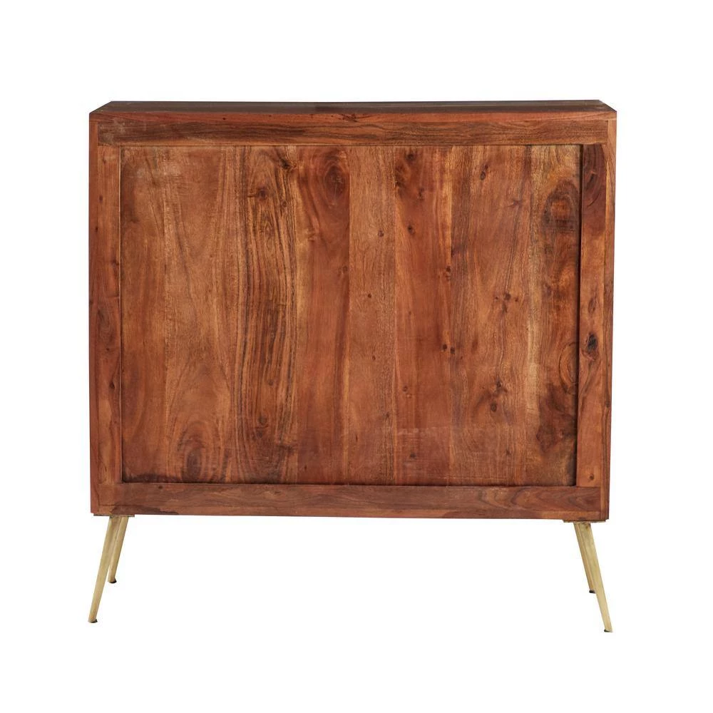 - This metal and wood storage cabinet has a warm brown finish with inlaid gold lines