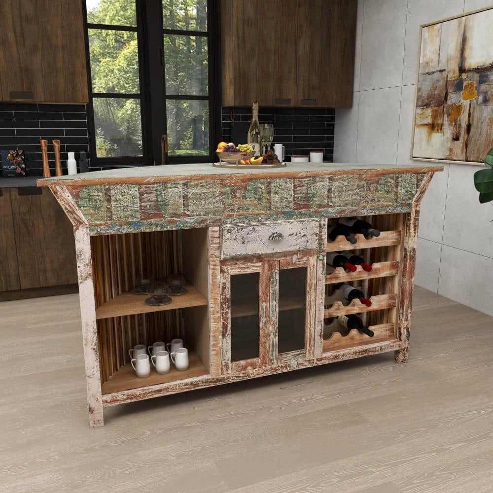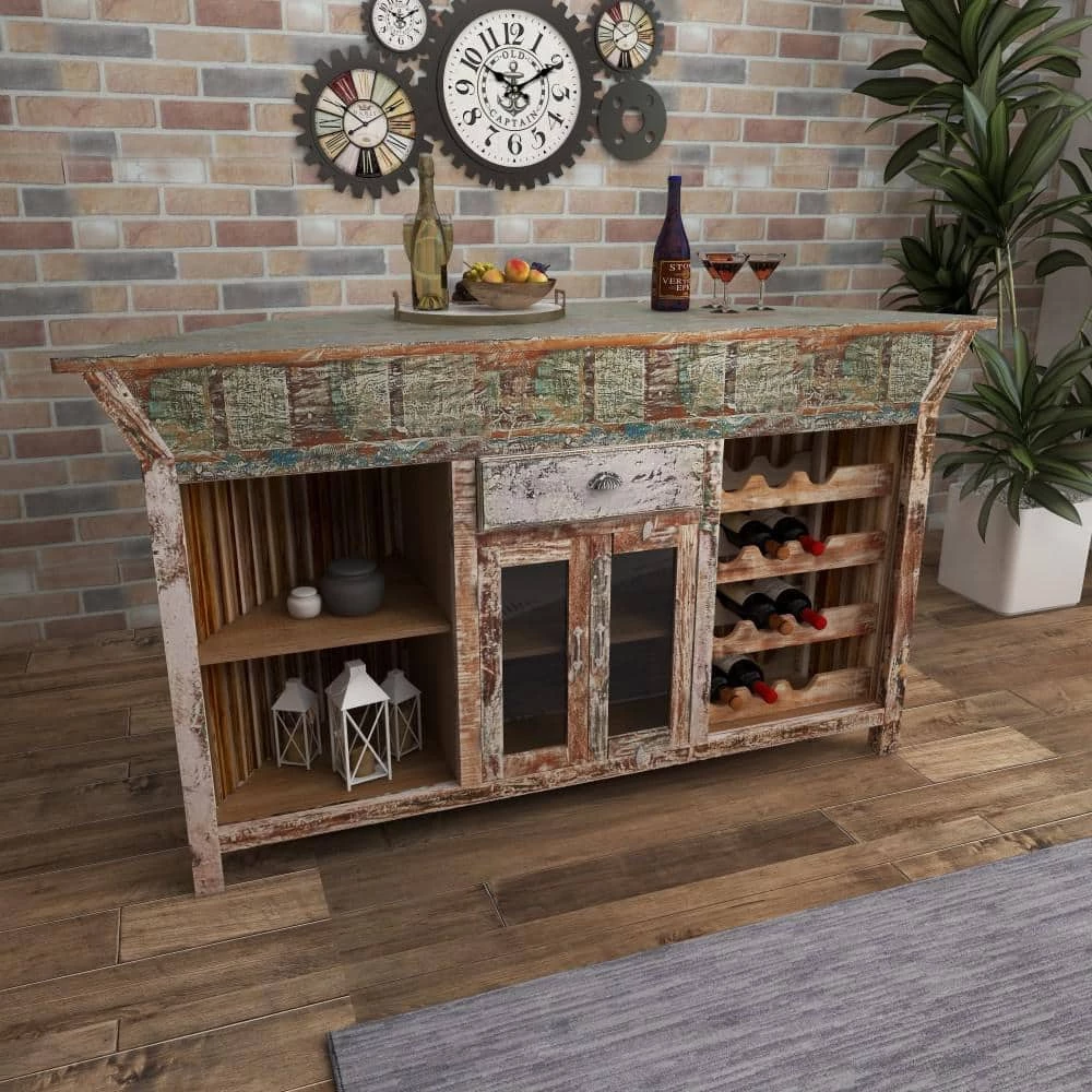 Make your friend thirsty with envy with this outdoor bar cart. Looks stylish in your living room or kitchen as a serving tray or as a decor stand. Use this furniture as the centerpiece to your home bar.. This accent furniture features a 2-door cabinet. This item ships in 1 carton. This accent furniture features 1 drawer with 16″L x 3″W measurements and 17″ depth. Suitable for indoor use only. Item has max weight of 200 lbs. Made in India. This accent furniture features 2 wooden shelves. Rustic Design. The holder rack can hold up to 12 standard size wine bottles.
