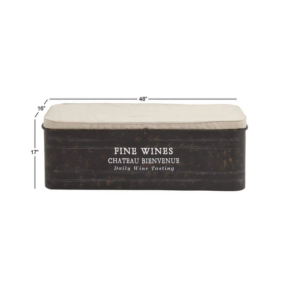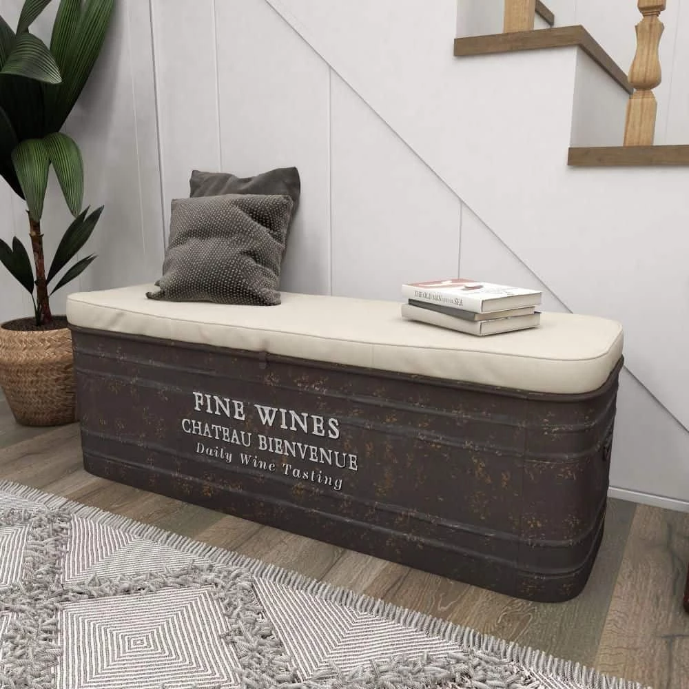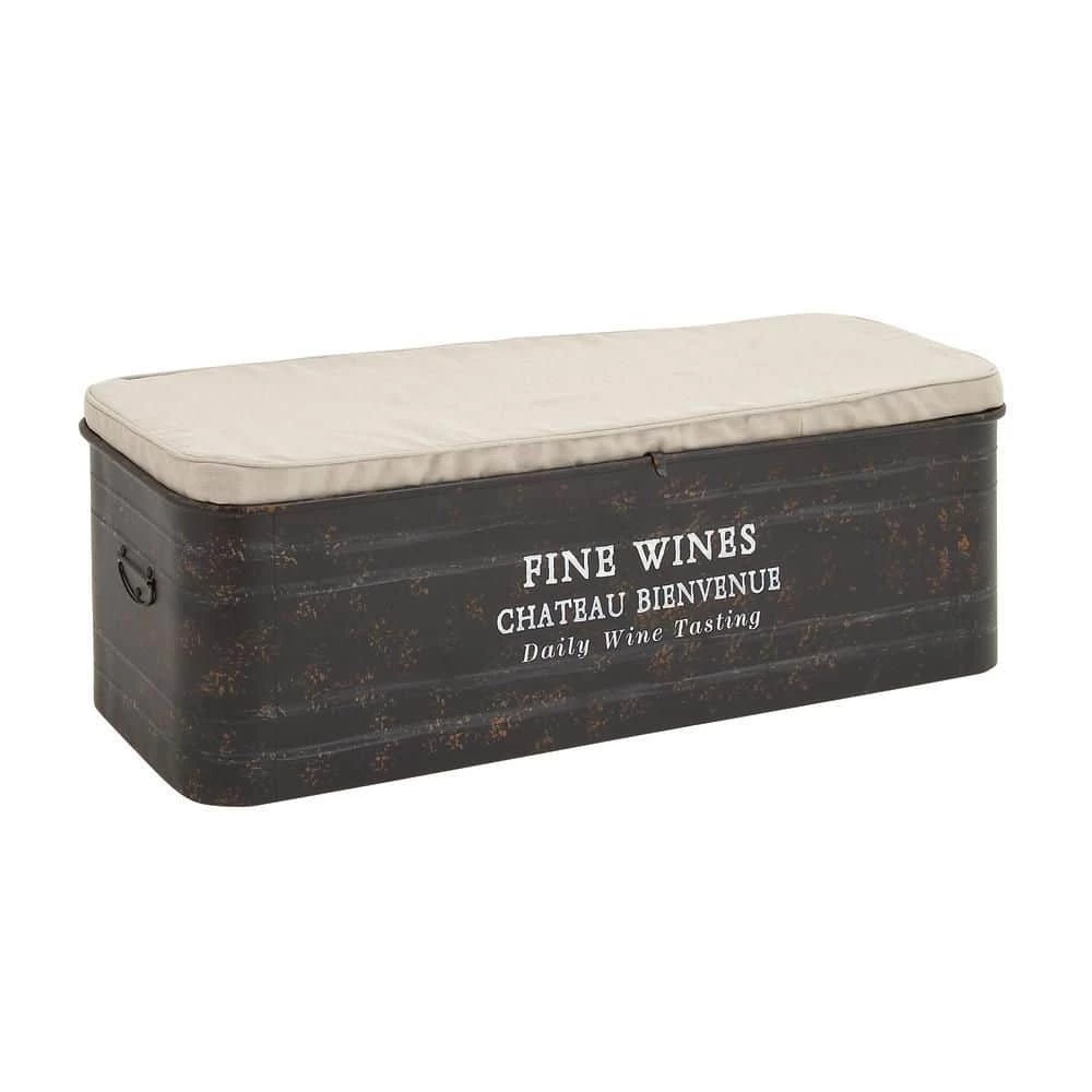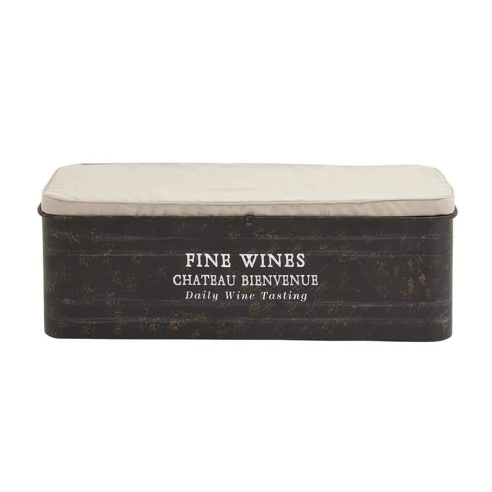 Rectangular storage bench will complement dark leather sofa with other heirloom decor for the perfect antique design style. This item ships in 1 carton. Suitable for indoor use only. 250 lbs. max weight limit. Industrial style. Typography includes “FINE WINES, CHATEAU BIENVENUE, Daily Wine Tasting”.