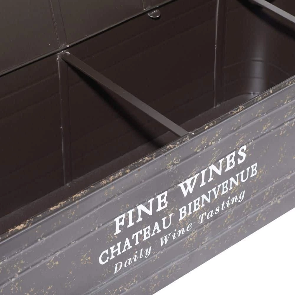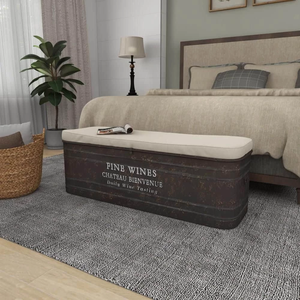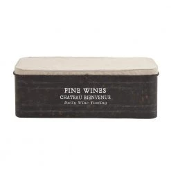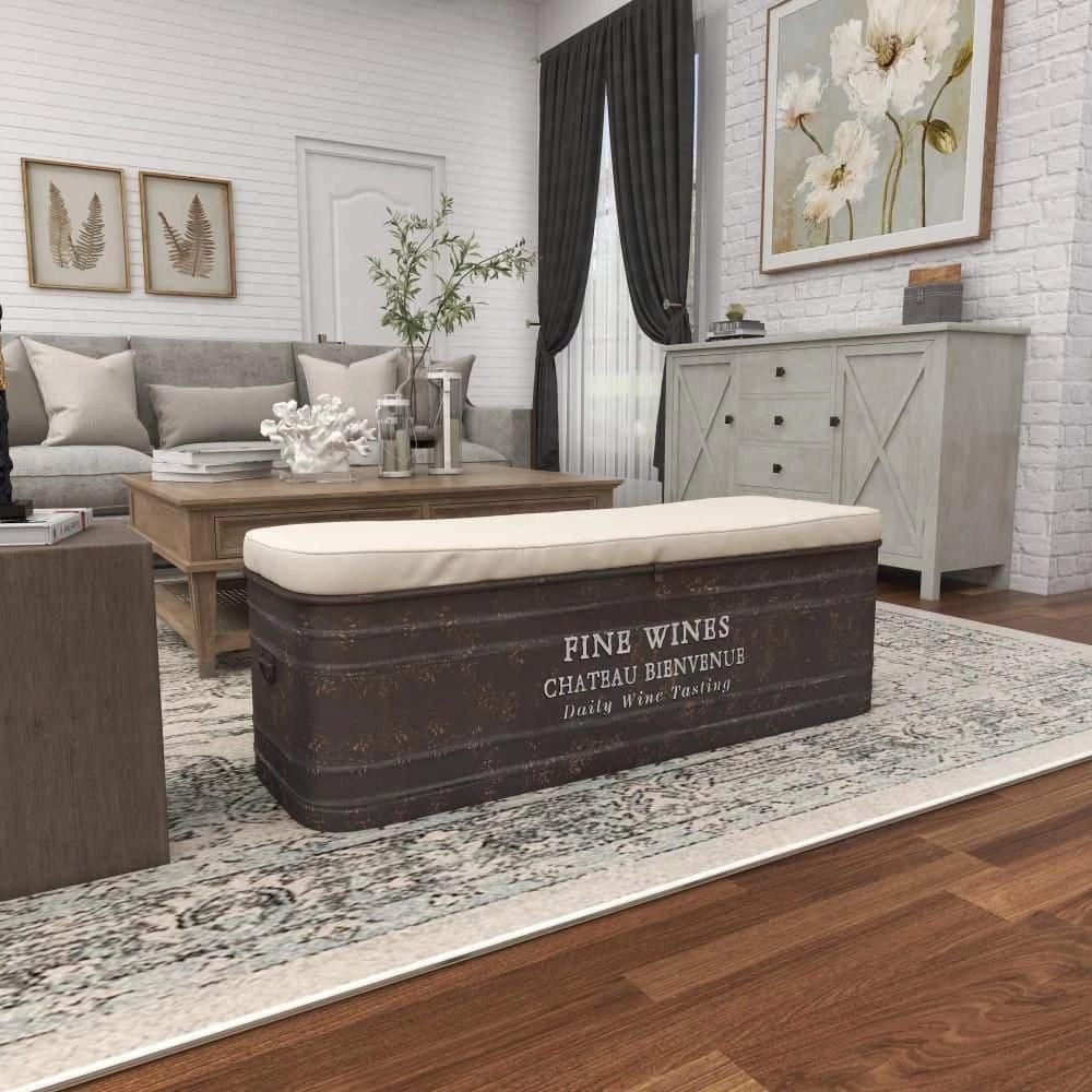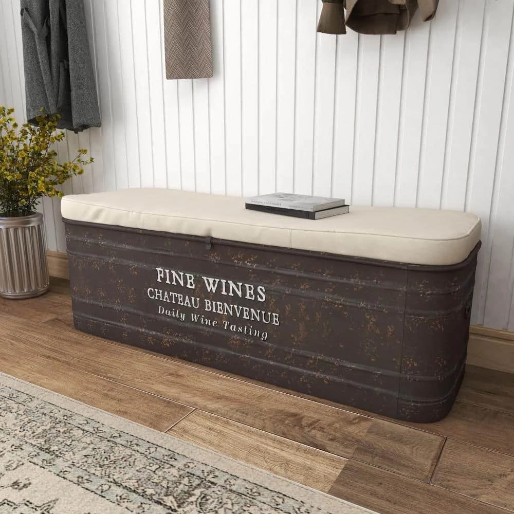 Rectangular storage bench will complement dark leather sofa with other heirloom decor for the perfect antique design style. This item ships in 1 carton. Suitable for indoor use only. 250 lbs. max weight limit. Industrial style. Typography includes “FINE WINES, CHATEAU BIENVENUE, Daily Wine Tasting”.