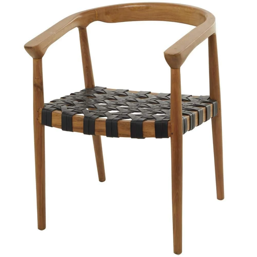 - Modern wooden chair features a polished brown teak wood body with a black leather woven seat