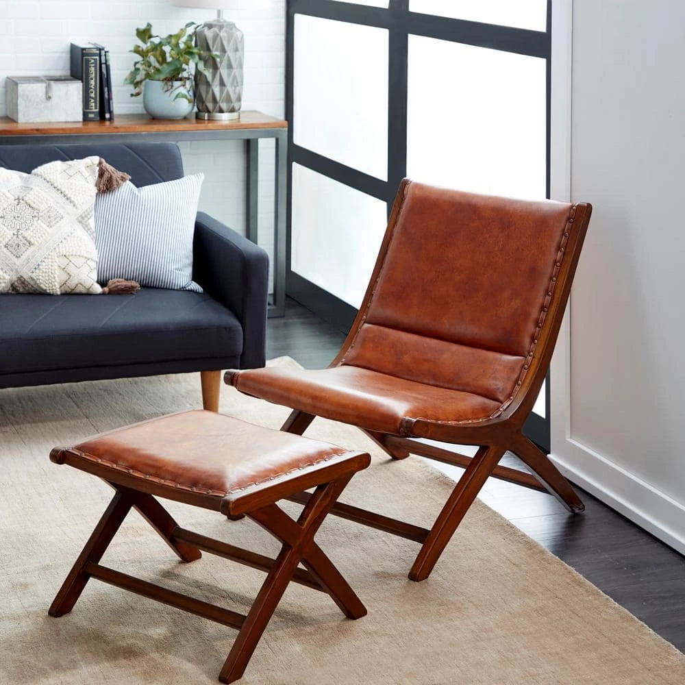 - Large brown leather chair and cushioned ottoman made with cow leather, teak wood, and metal hardware