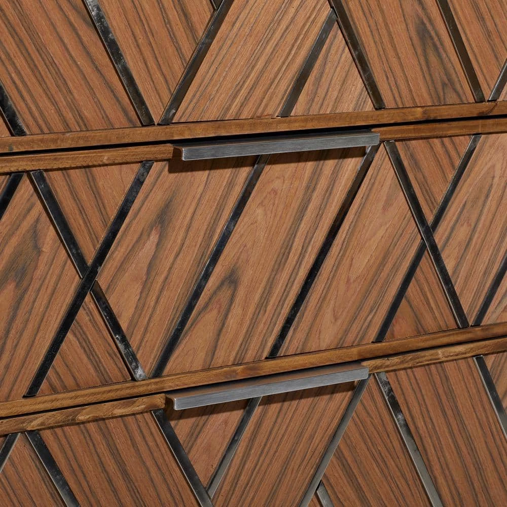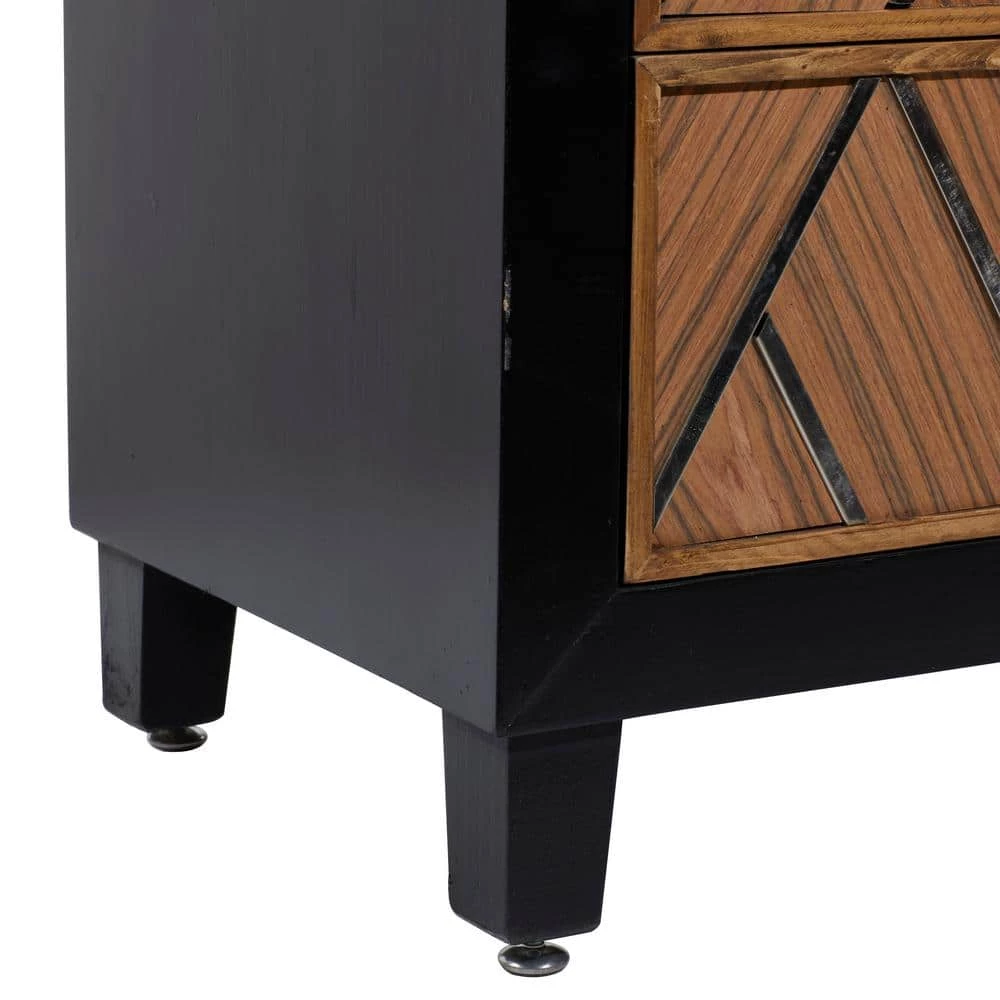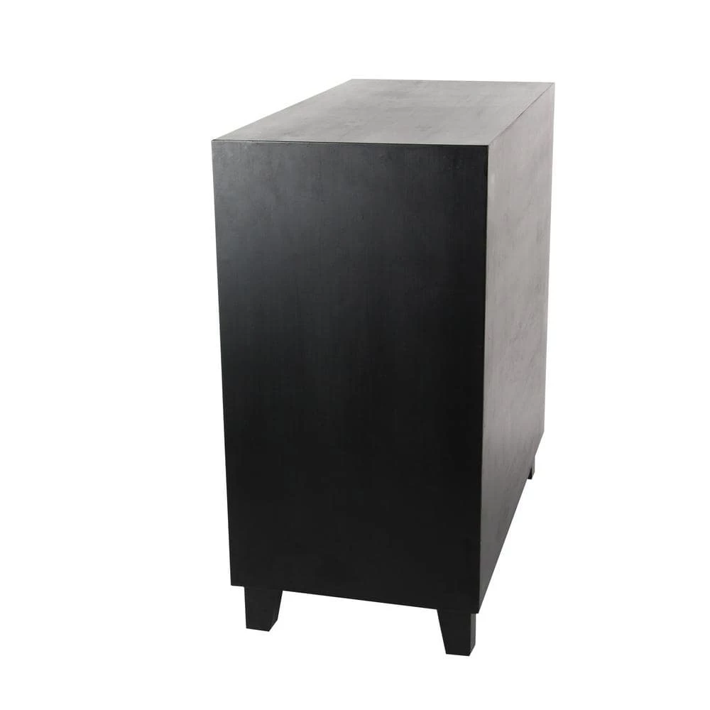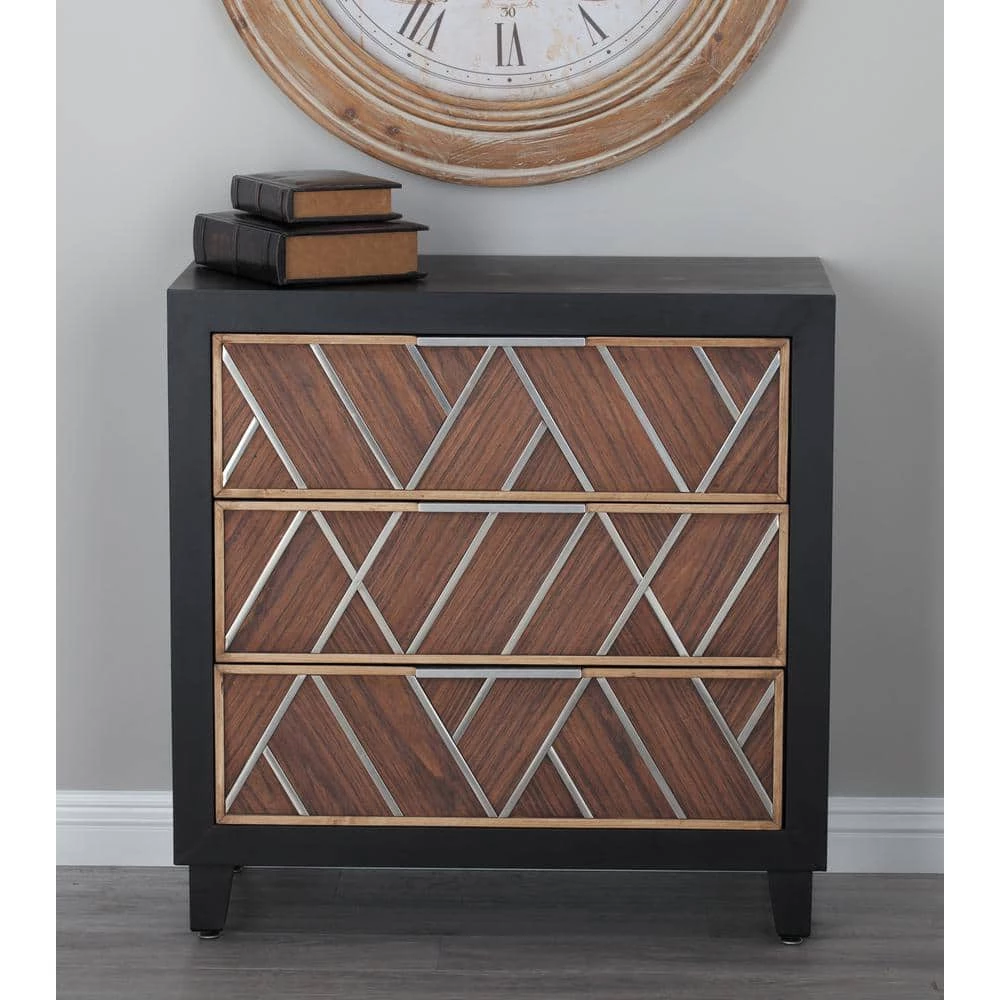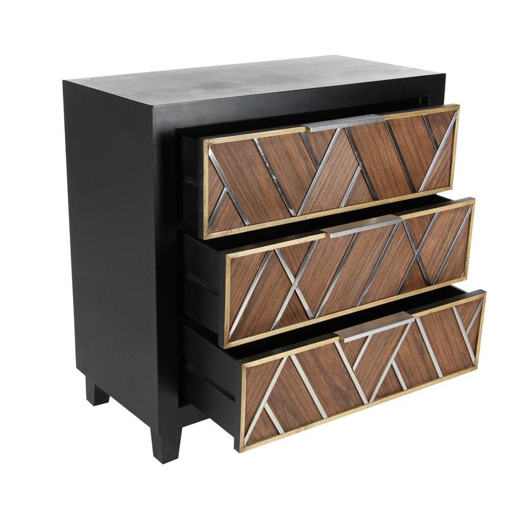 - Black storage unit features a sleek silhouette with spacious drawers designed with diagonal wood paneling and separated by metal strips and L-shaped bar handles