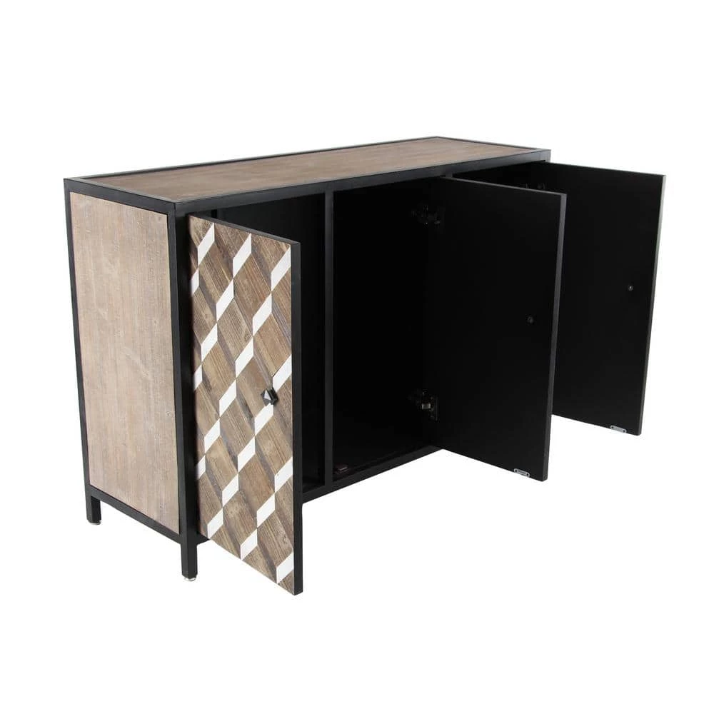 - A large storage sideboard features a magnificent wood paneling forming a 3D stacking cube pattern on each cabinet doors with magnetic closure and pyramid knobs