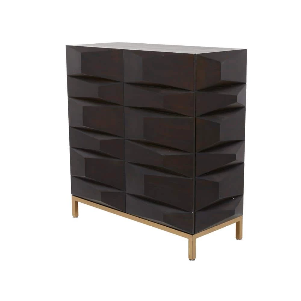 - The wooden accent cabinet is intricately carved to create a faceted design and unique appeal