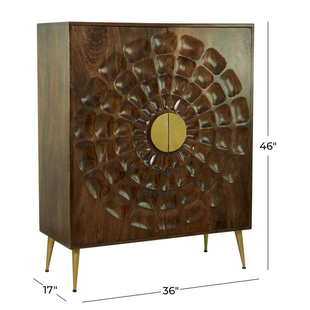 - Wood is carved and polished into this storage cabinet and attached with iron splayed leg stands