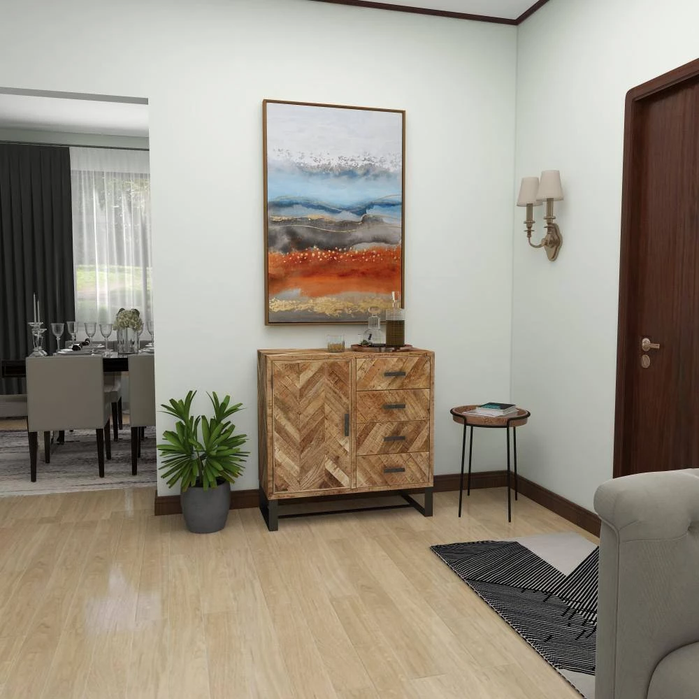 A practical yet stylish upgrade that instantly elevate the look of your room. Maintain a clutter free zone and stay organize with this chic cabinet. Add this brown cabinet with doors in your living room and decorate with books and fresh cut flowers in glass vase for a rustic appeal. Item features 1 cabinet door and 4 rectangular drawers with a drawer weight capacity of 30 lbs.. This item ships in 1 carton. Suitable for indoor use only. Some assembly required. Item has maximum weight limit of 100 lbs.. Made in India. This item has 1 shelf. Contemporary theme.