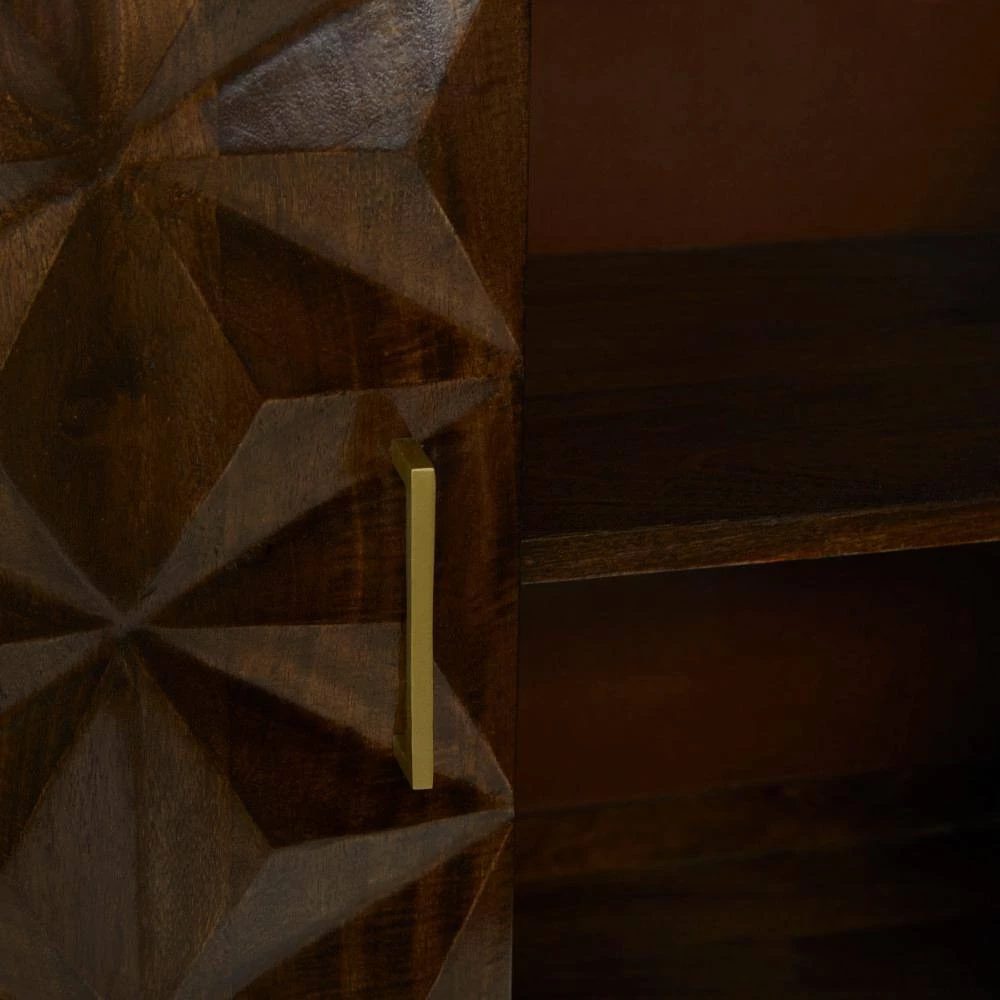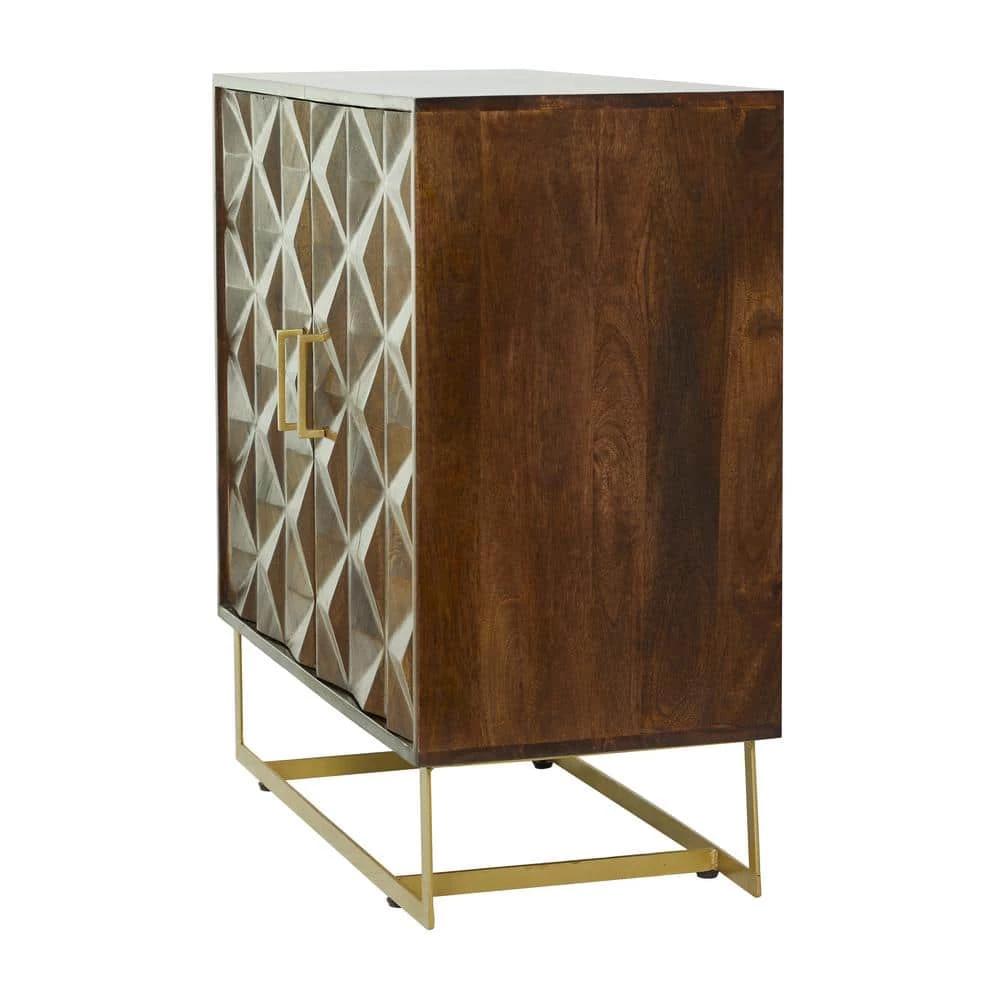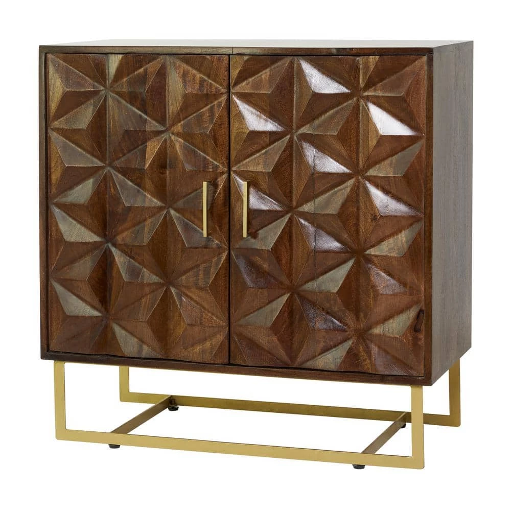 - This luxurious mango wood cabinet features a large rectangular body styled with a unique diamond faceted body and a two-door cabinet with a 2-tier shelving unit