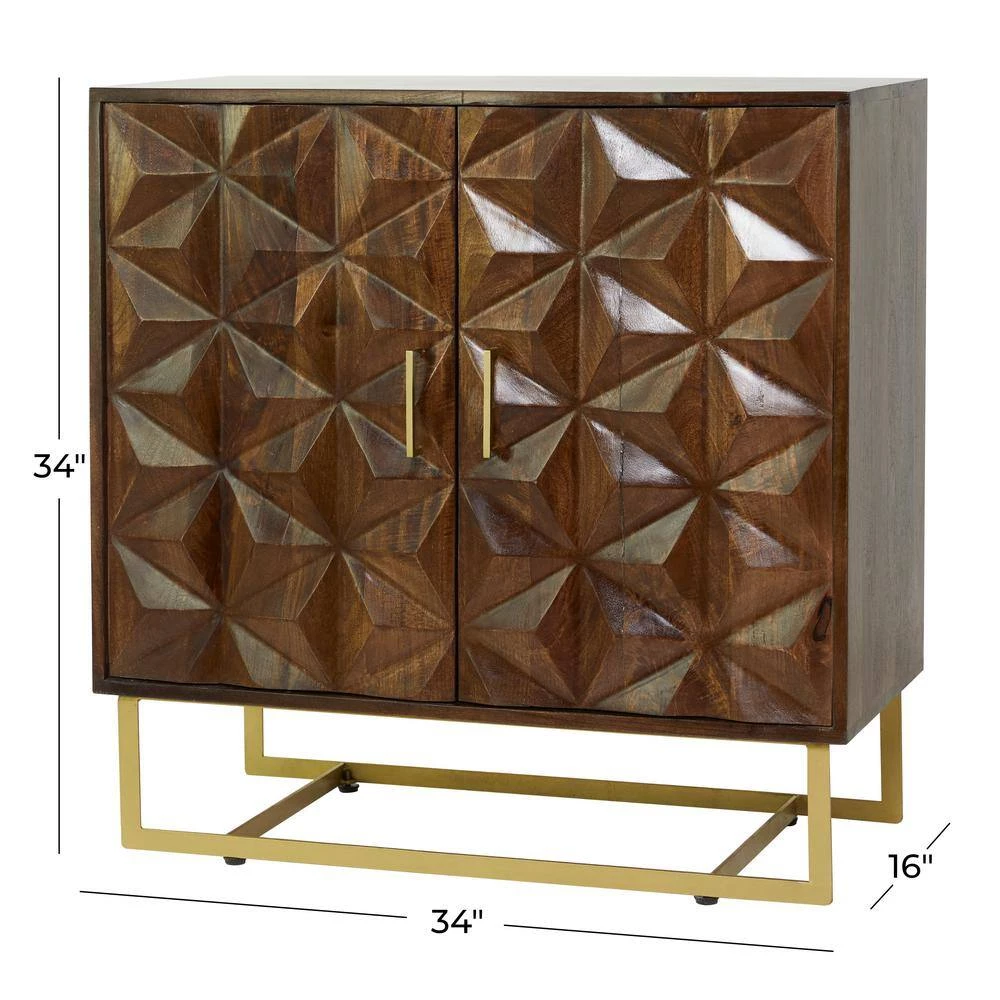 - This large wood accent storage cabinet showcases a rectangular cabinet body with diamond faceted doors and slim cut T-shaped iron legs