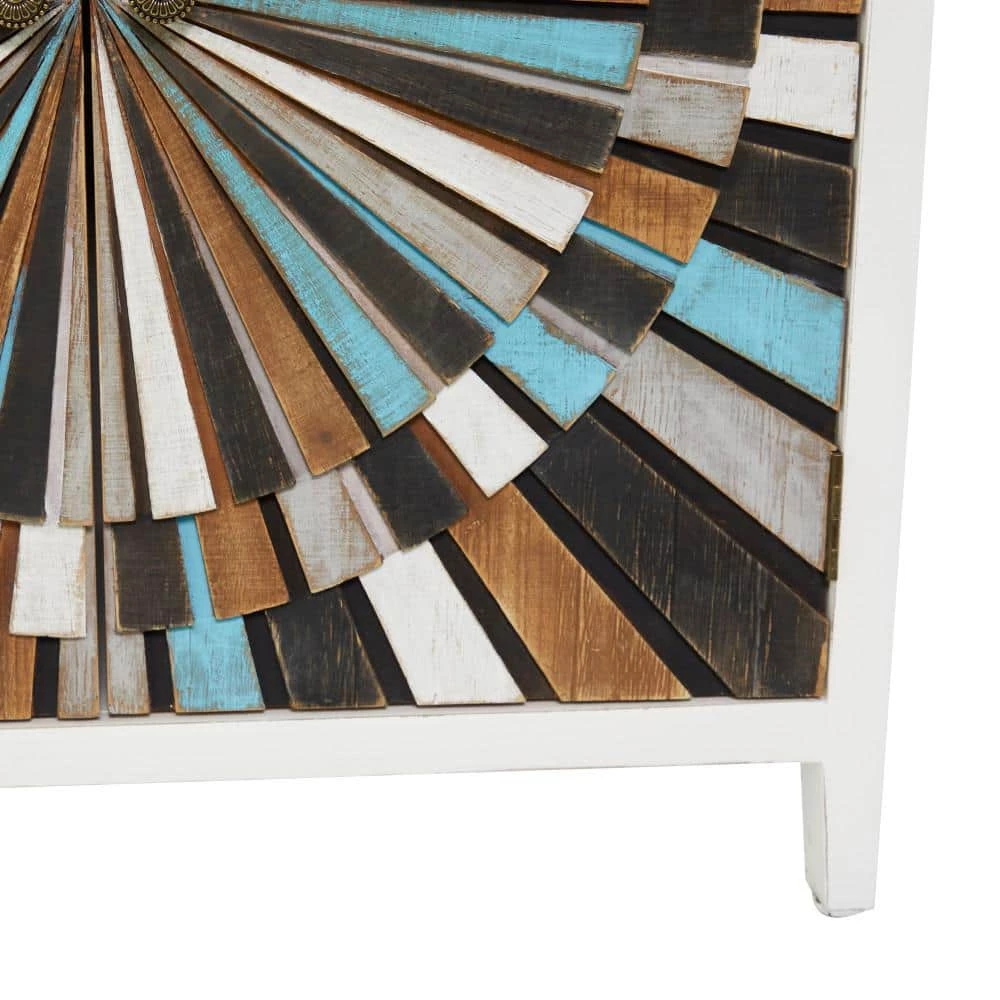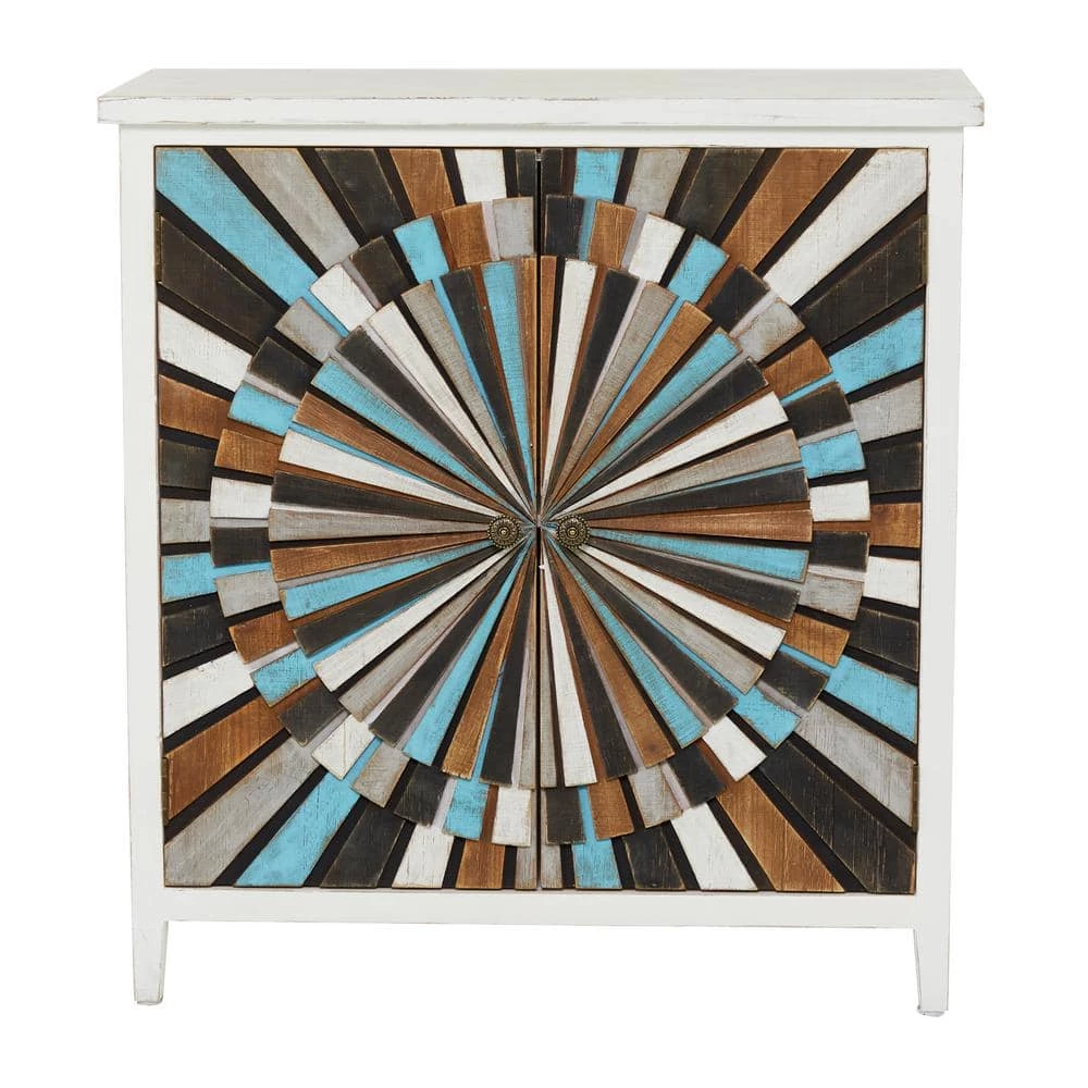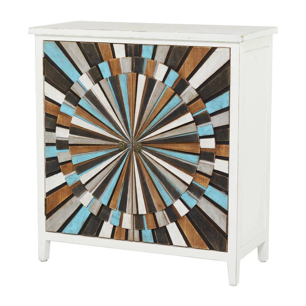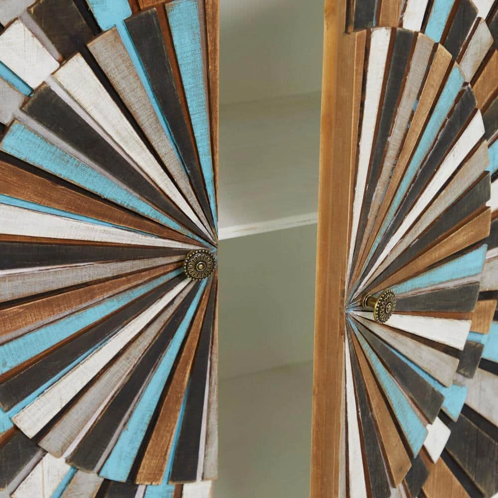 - Multi color 2 door storage cabinet carries a rectangular shape and a sunburst pattern