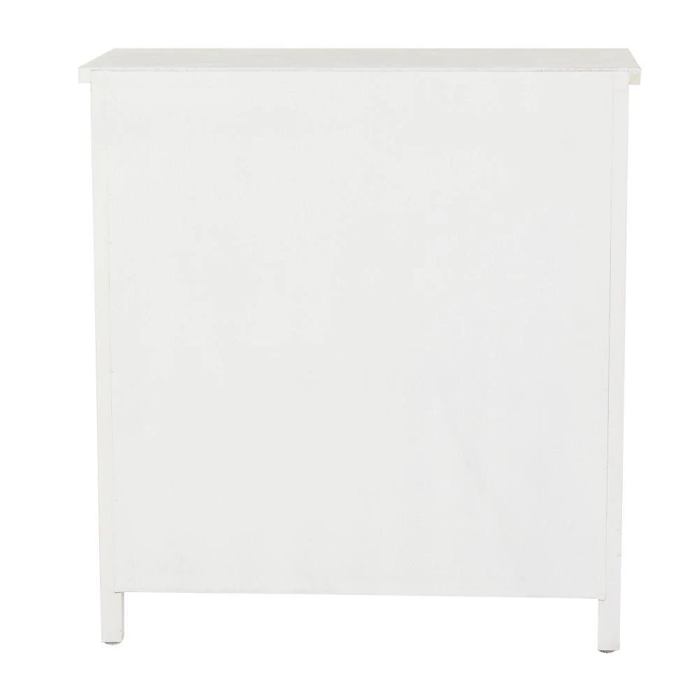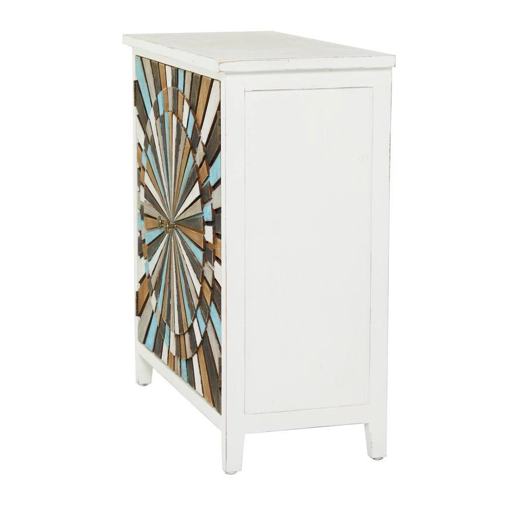 - White storage cabinet is crafted of wooden structured and painted to create a striking sunburst design