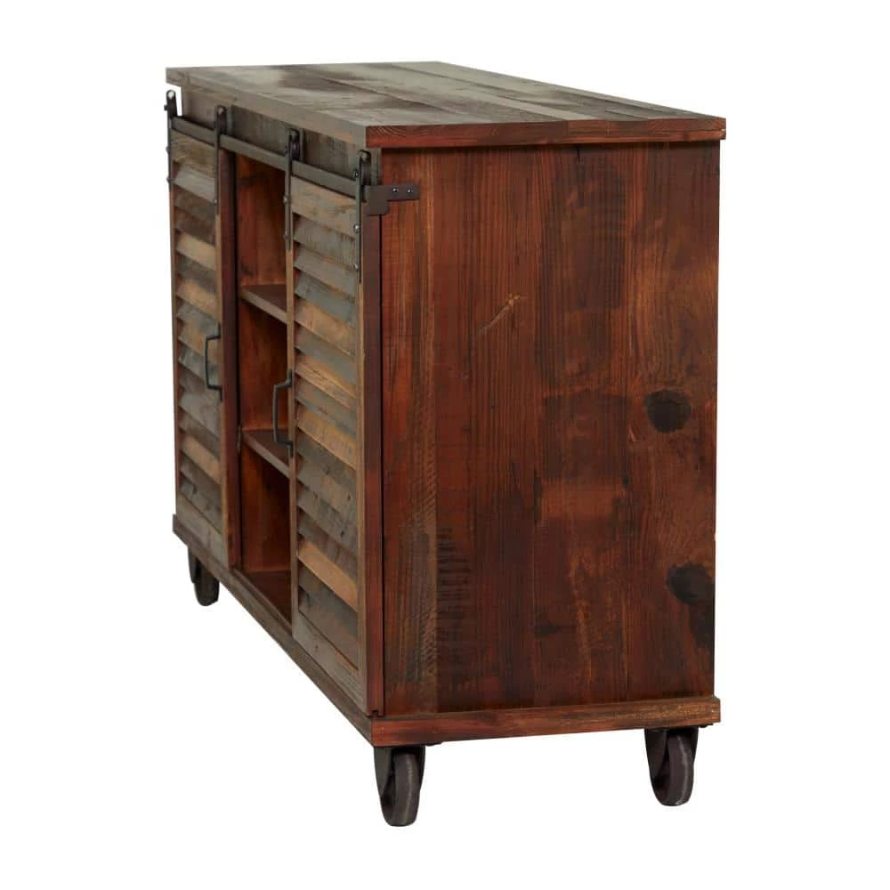 - Pine wood slabs are assembled together into a storage cabinet with sliding doors and iron wheels