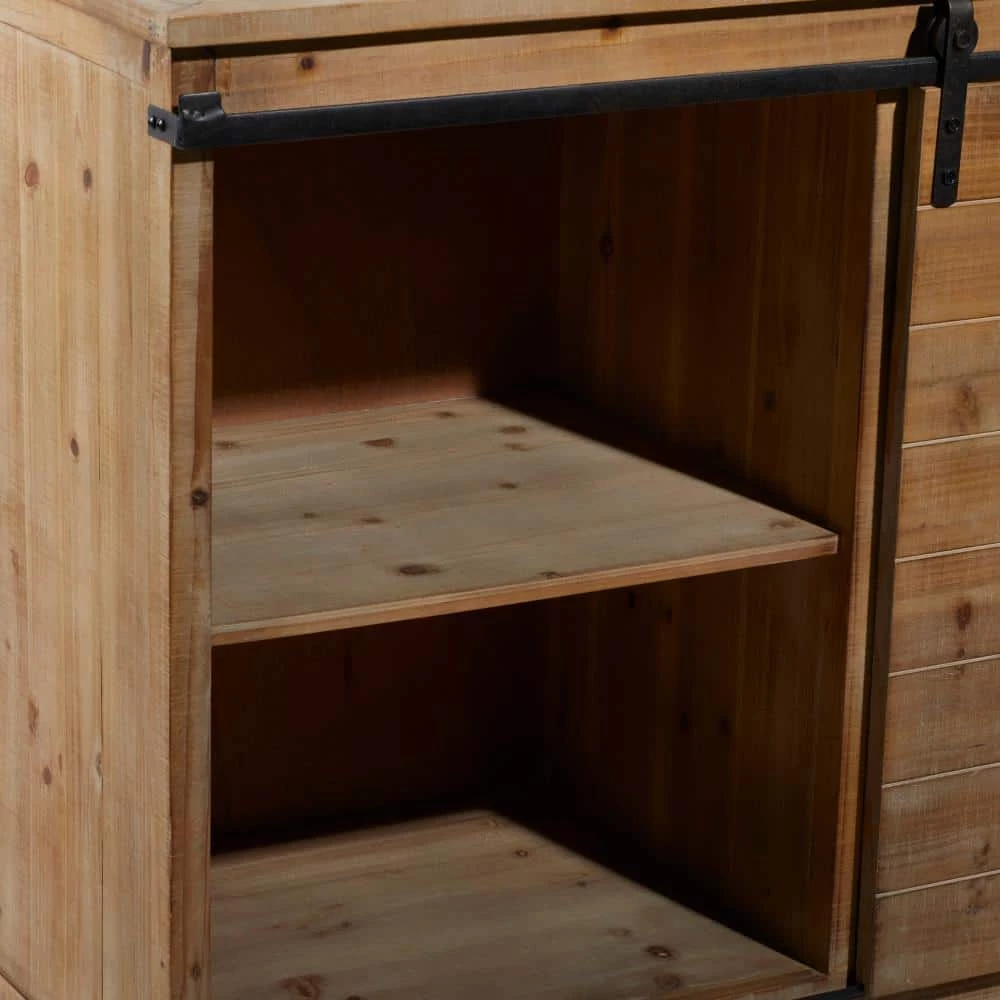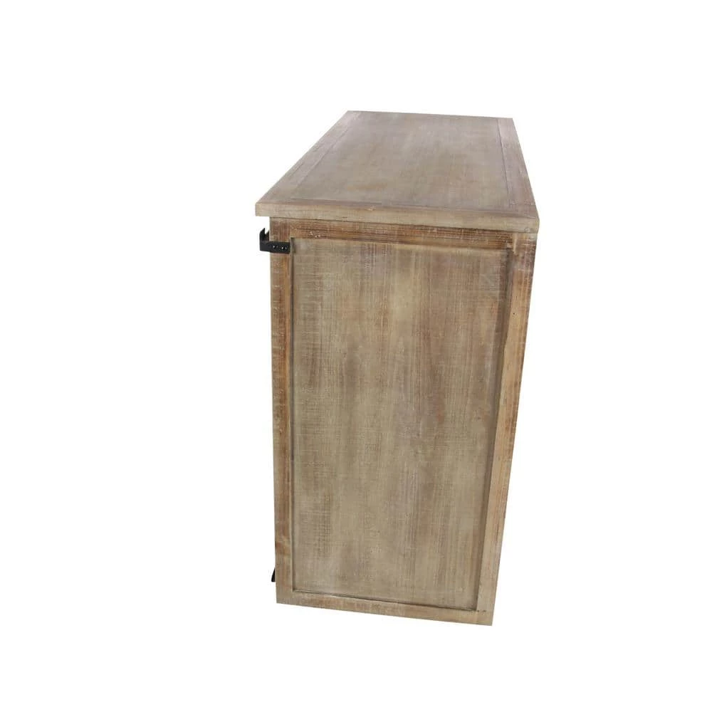 - Farmhouse sideboard cabinet carries a natural light brown finish with whitewash distressing and black metal hardware