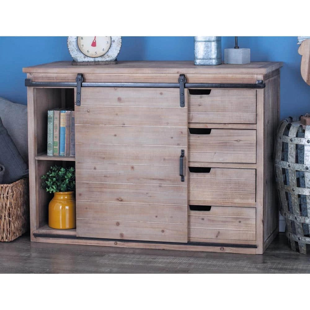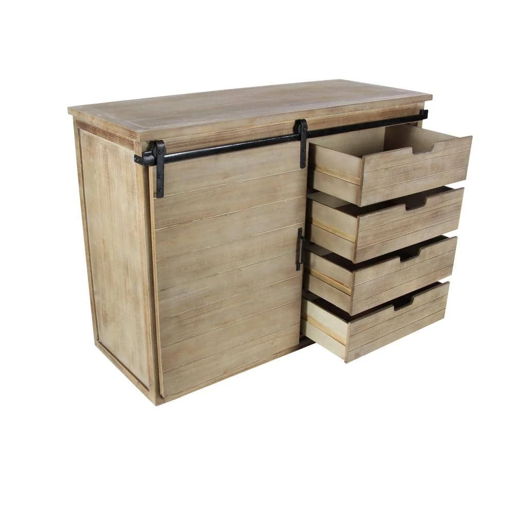 A practical yet stylish upgrade that instantly elevate the look of your room. Maintain a clutter free zone and stay organize with this chic cabinet. Create an rustic display with this storage unit and decorate it with large organic vases on top of books under an oversized wall mirror. Comes with cabinet interior measuring 21″L x 16″W x 13″H . This item ships in 1 carton. 4 drawers measure 18″L x 14″W x 5″H. A horizontal track that cabinet door slides on large black iron handle on cabinet door. Suitable for indoor use only. Maximum weight limit is 100 lbs. Features 2 cabinet shelves with 43″ and 50″ thickness. Rustic design.