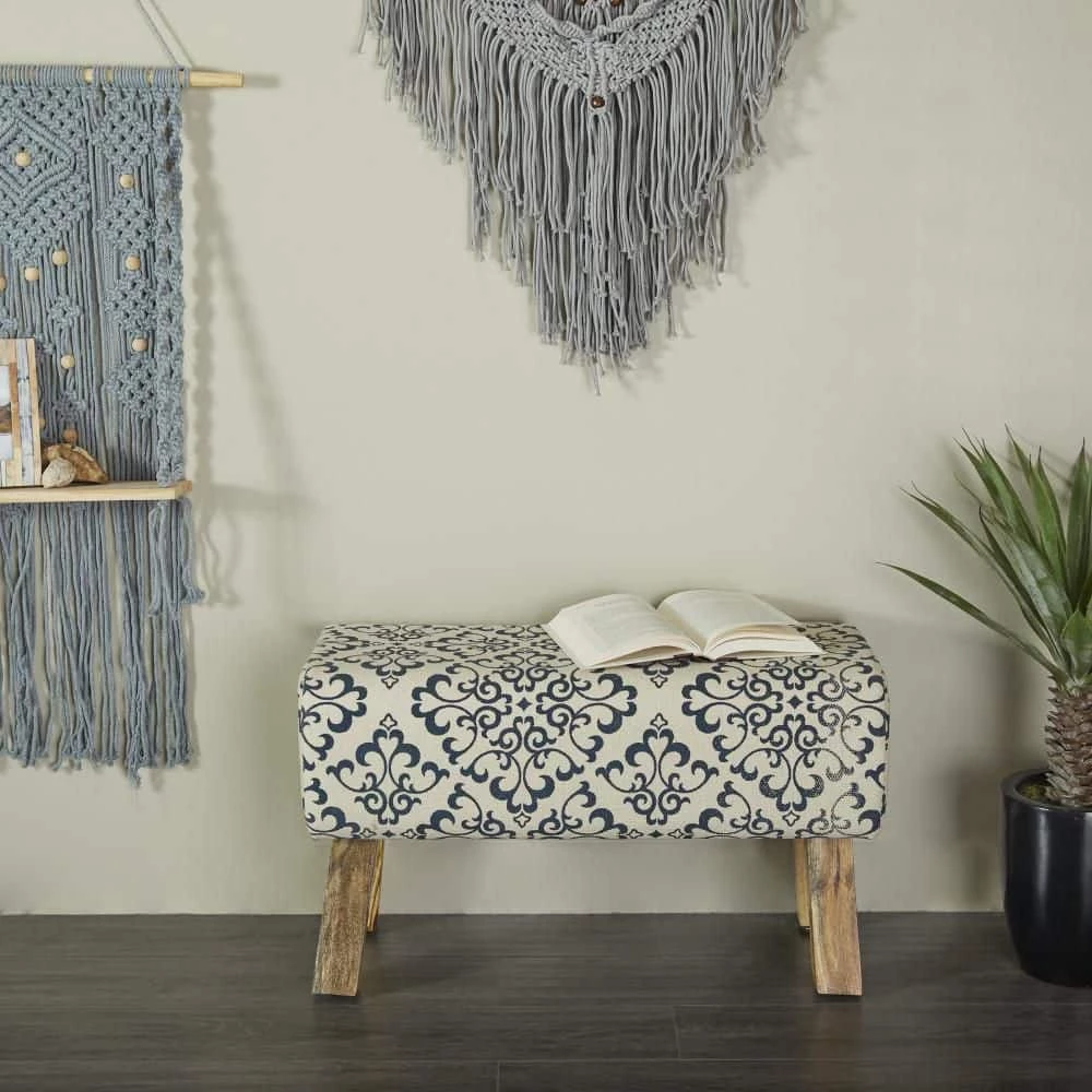 - A decorative bench for home crafted of robust wood and cushioned fabric materials