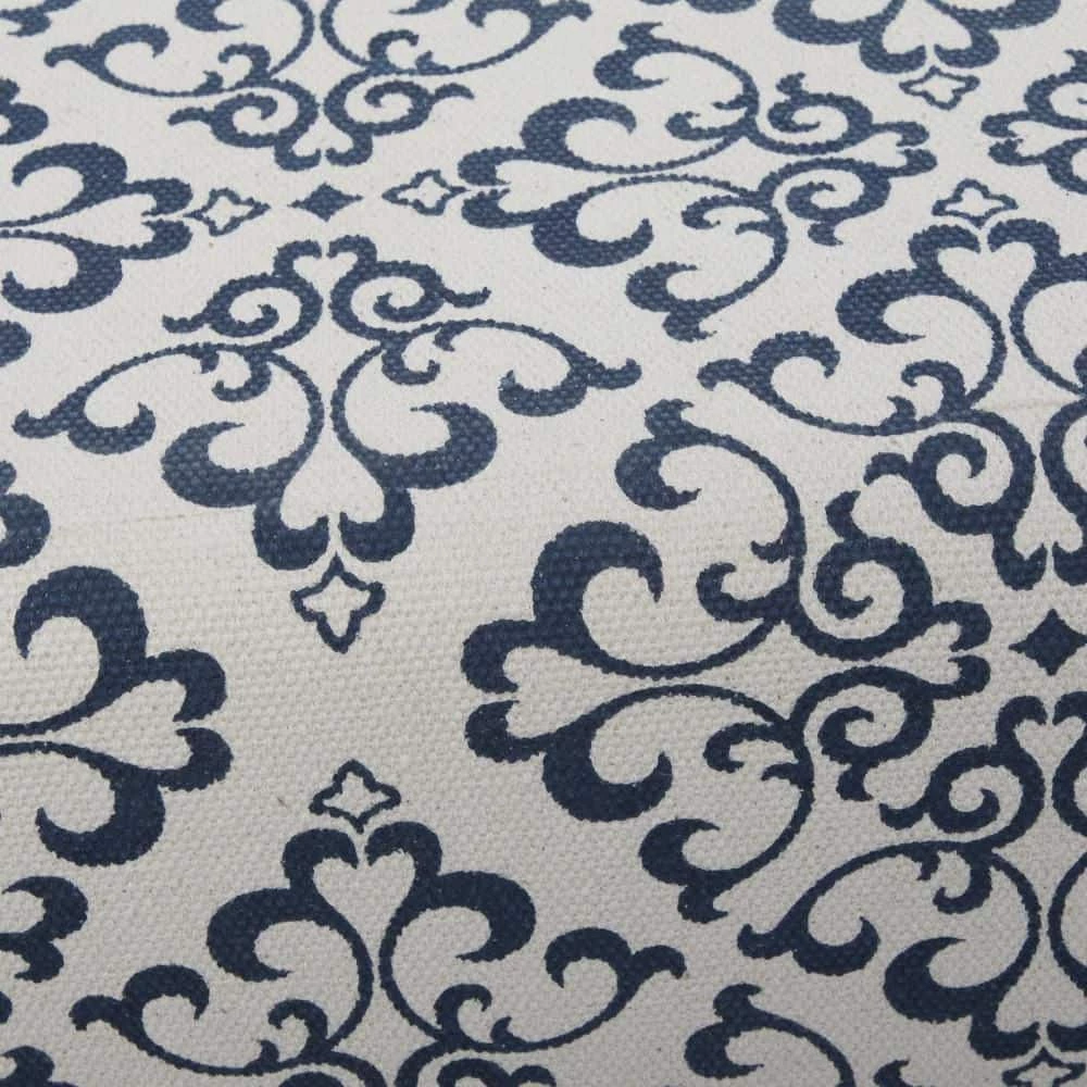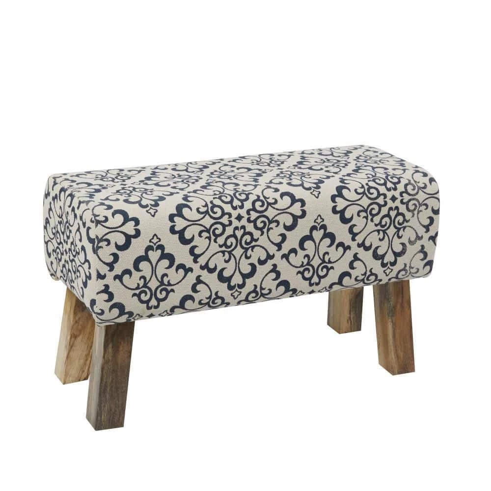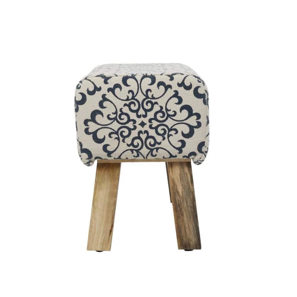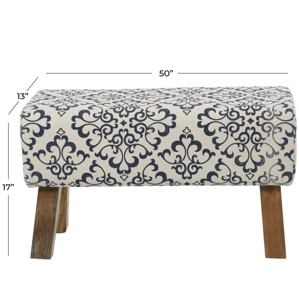 - Long upholstered bench carries white upholstery with blue design and brown wooden legs