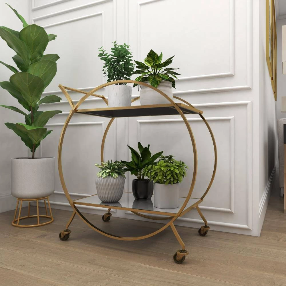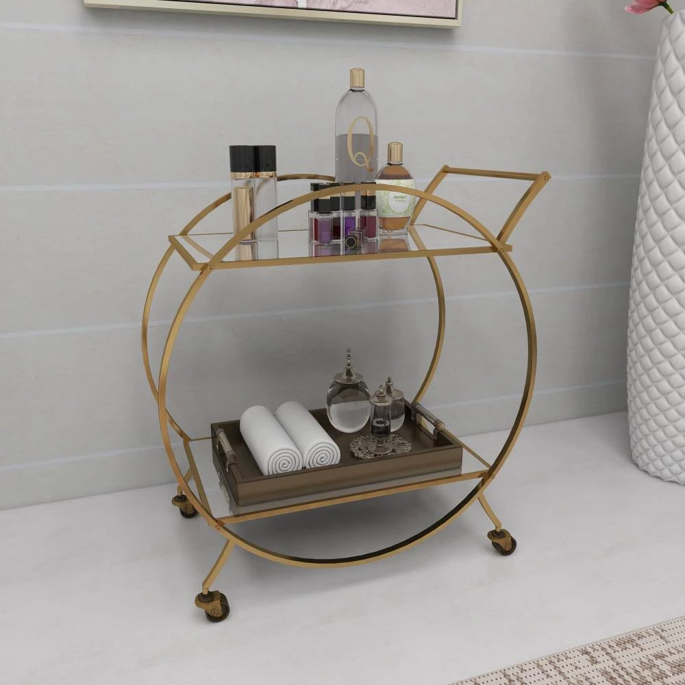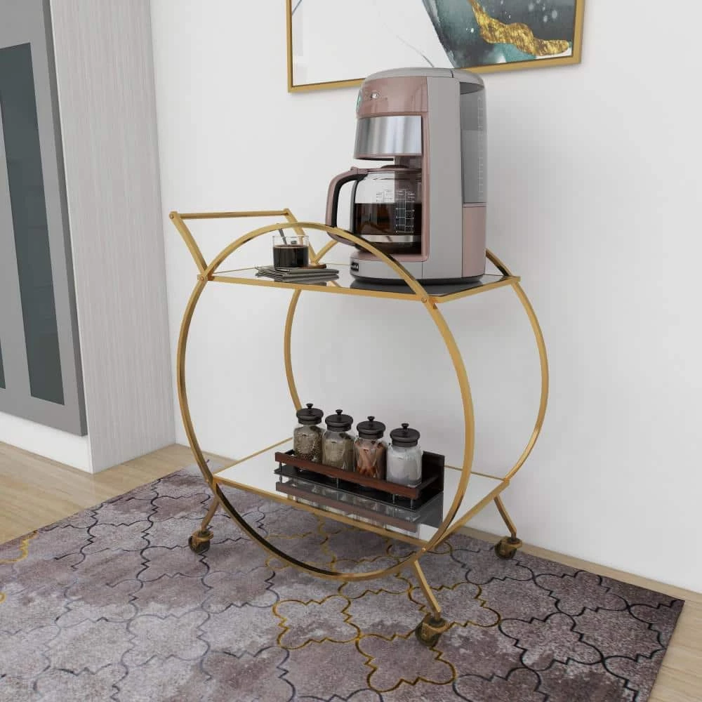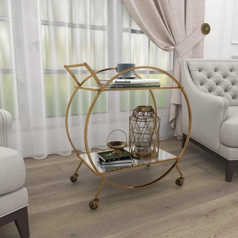 - Gold serving cart features duo round metal side frames with high bar handle, two spacious mirror shelves and supported by smooth caster wheels for optimal mobility