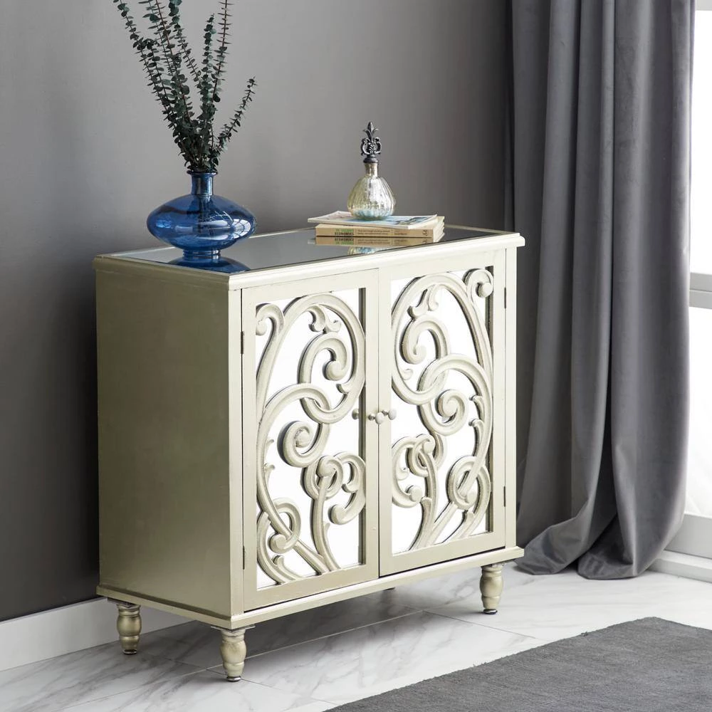 - Rectangle wooden cabinet with doors carries a floral inspired carving on reflective mirror panels and ornate feet
