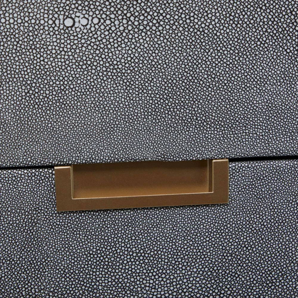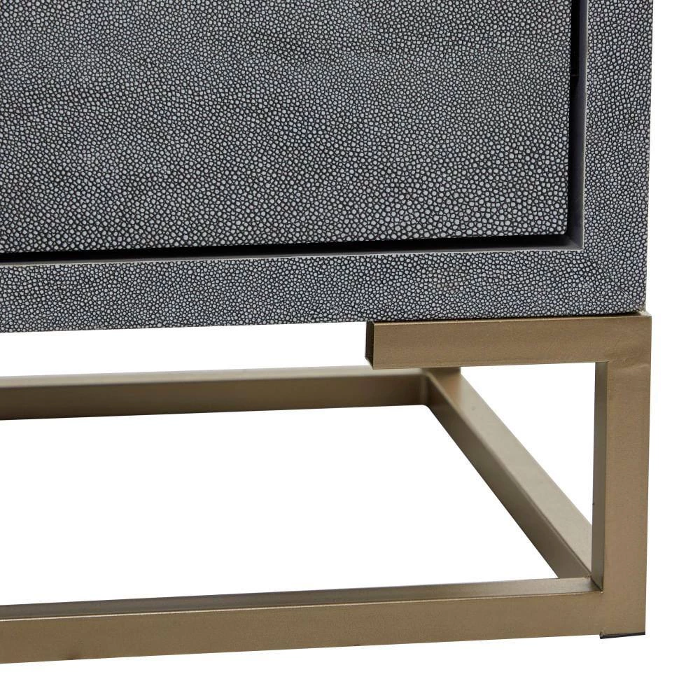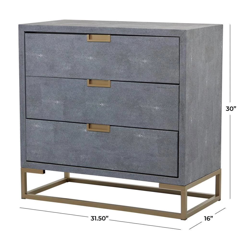 - A 3-drawer decorative cabinet highlighting a gray wooden structure with white speckled abstract pattern, spacious pull-out drawers with bronze rectangular metal handles, and open-designed metal base with rubber stoppers