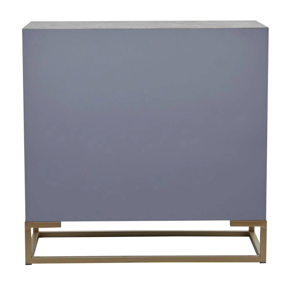 - An accent piece featuring a gray cabinet with bronze metal handles and base
