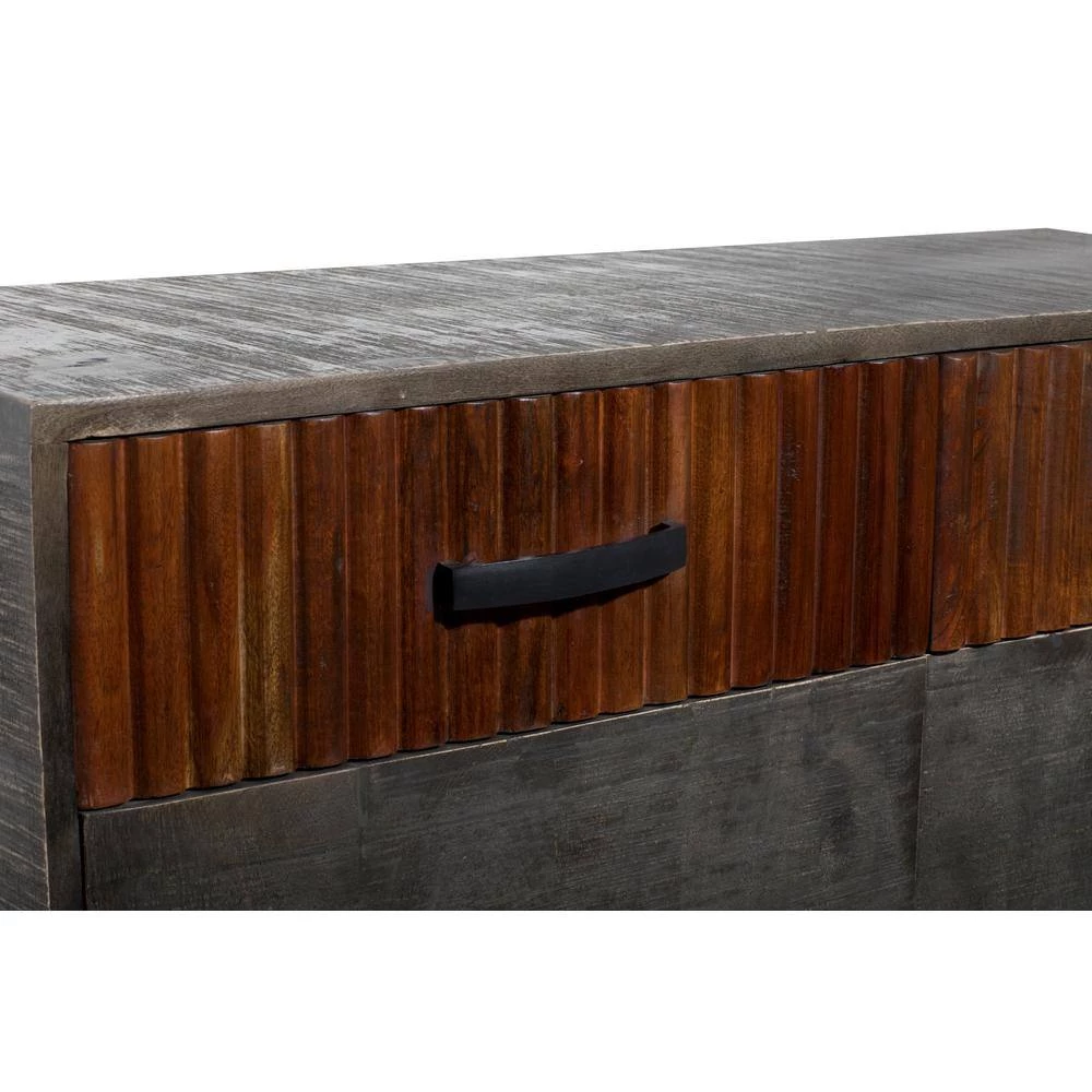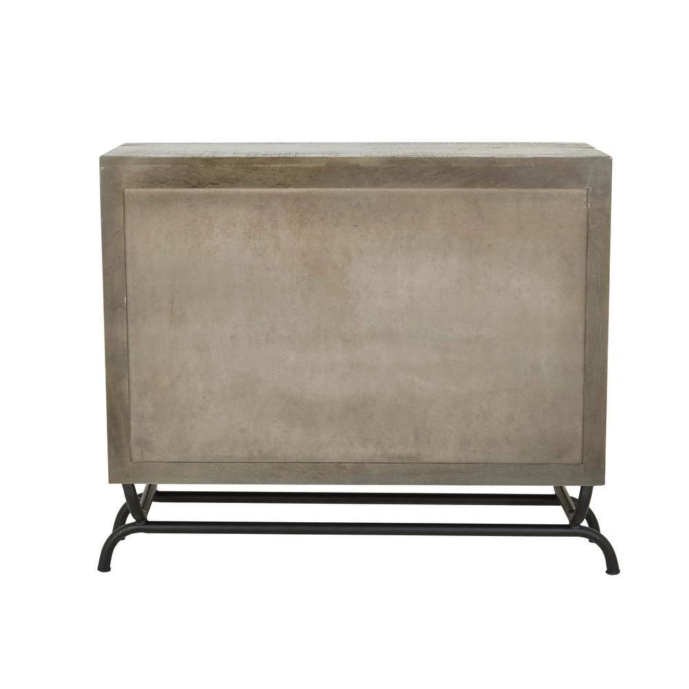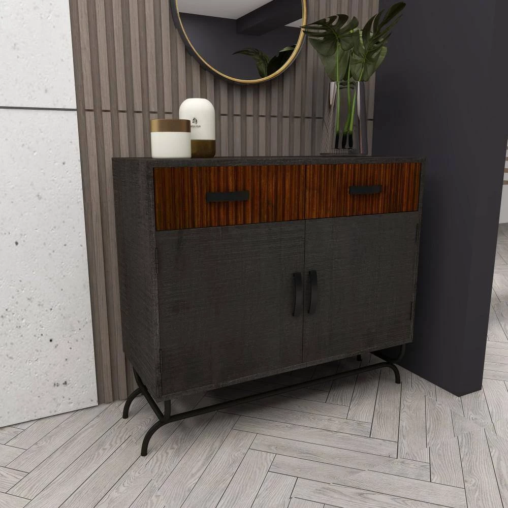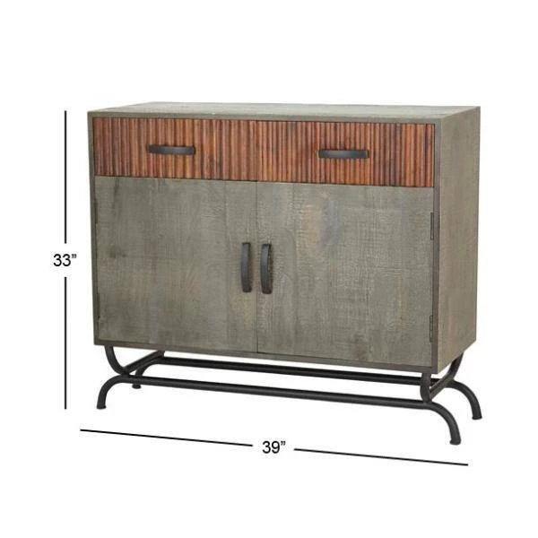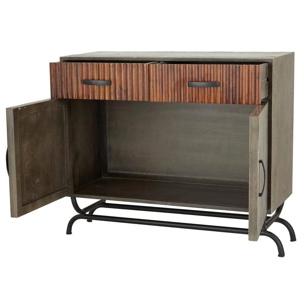 - This 2 door cabinets with drawers are made of a solid metal frame with mango wood accent