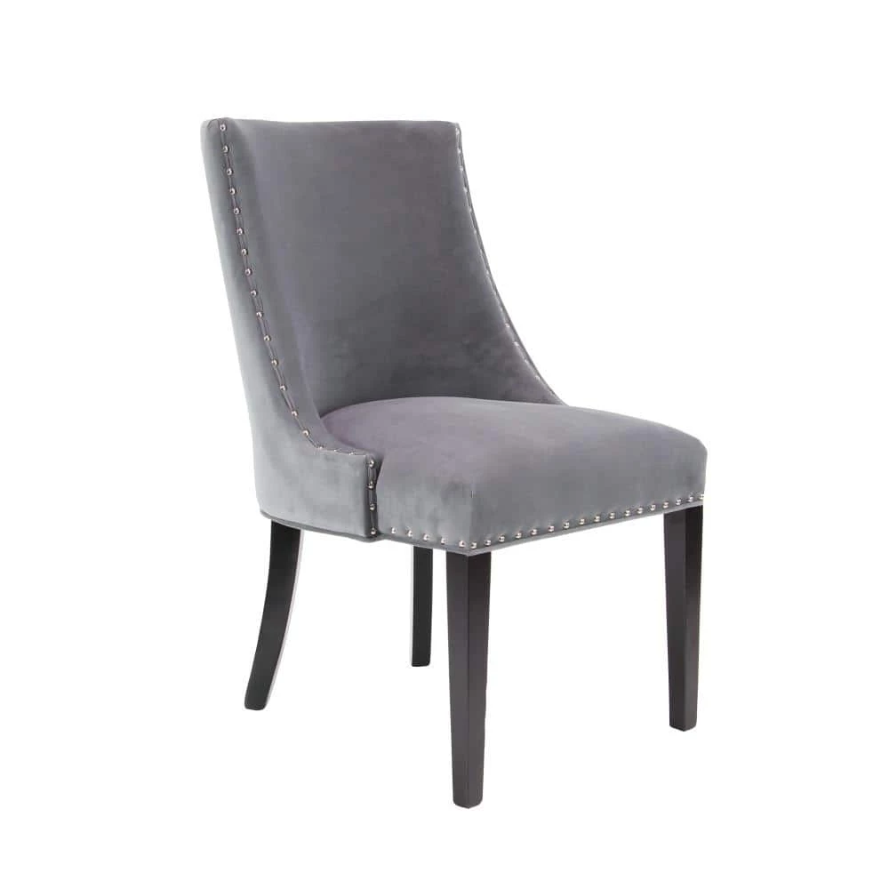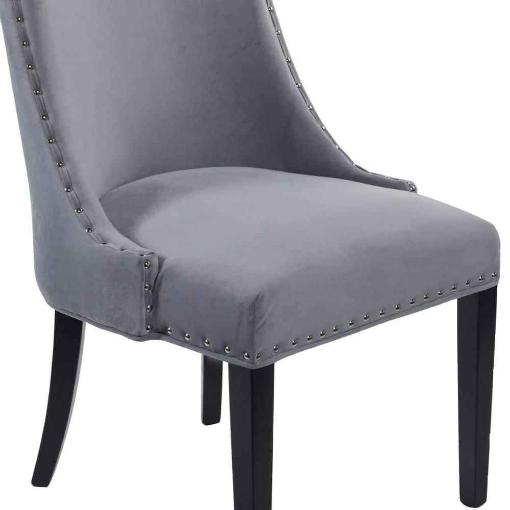 - High back accent chair carries grey upholstery with black legs and silver nail heads