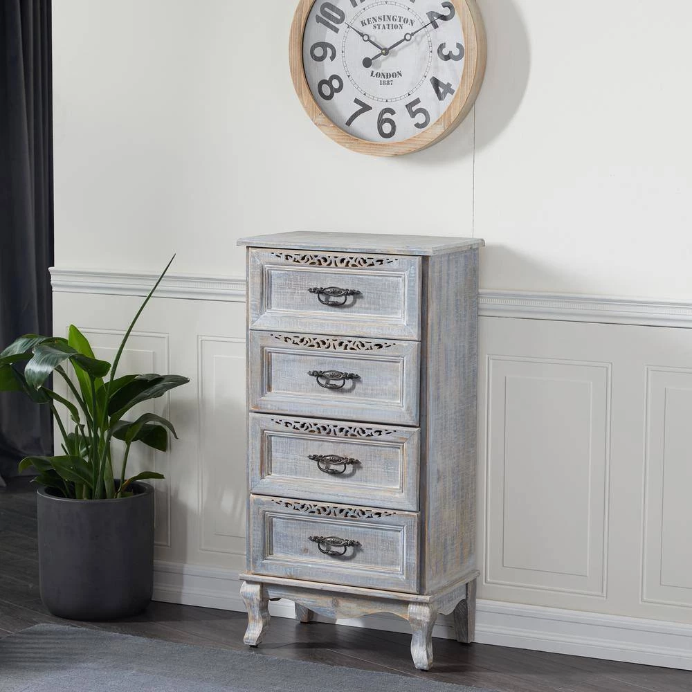 - Wood is sculpted and given a rustic vintage storage drawer design