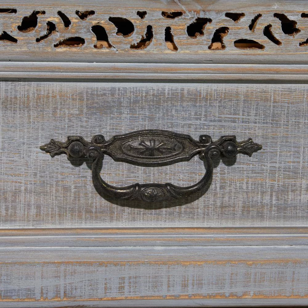 - Wooden cabinet has two drawers with carvings and distressed paint open with pull handles