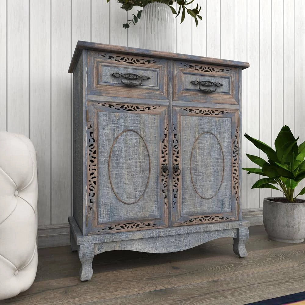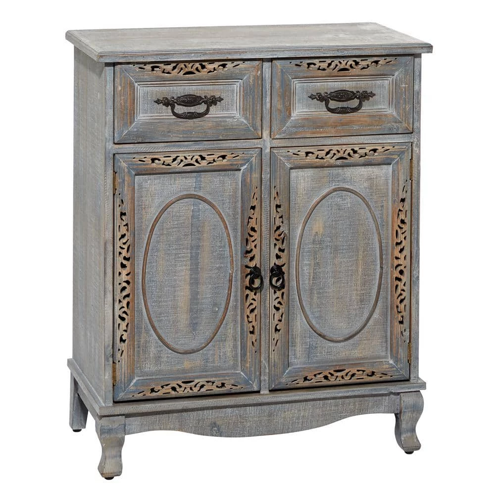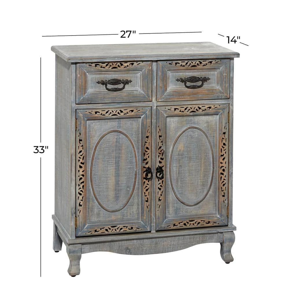 - This vintage buffet cabinet highlights a heavily distressed ash grey finish with accent detailed carvings