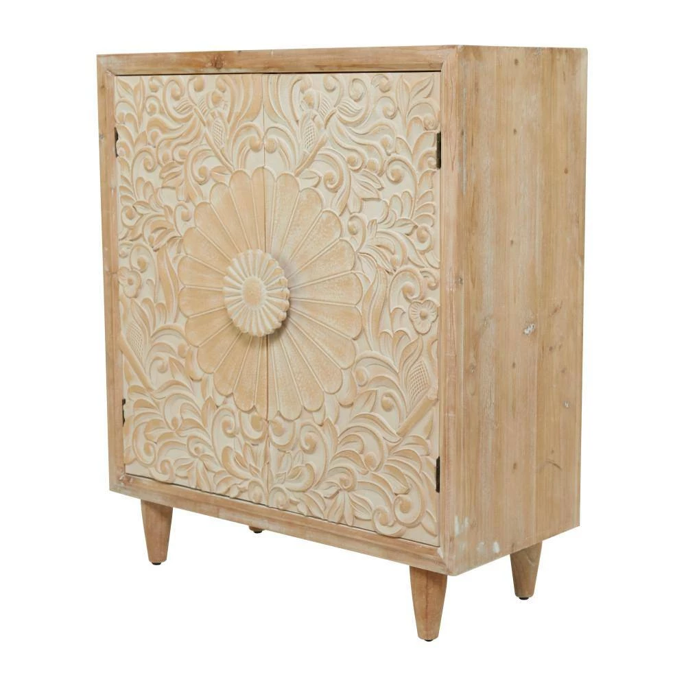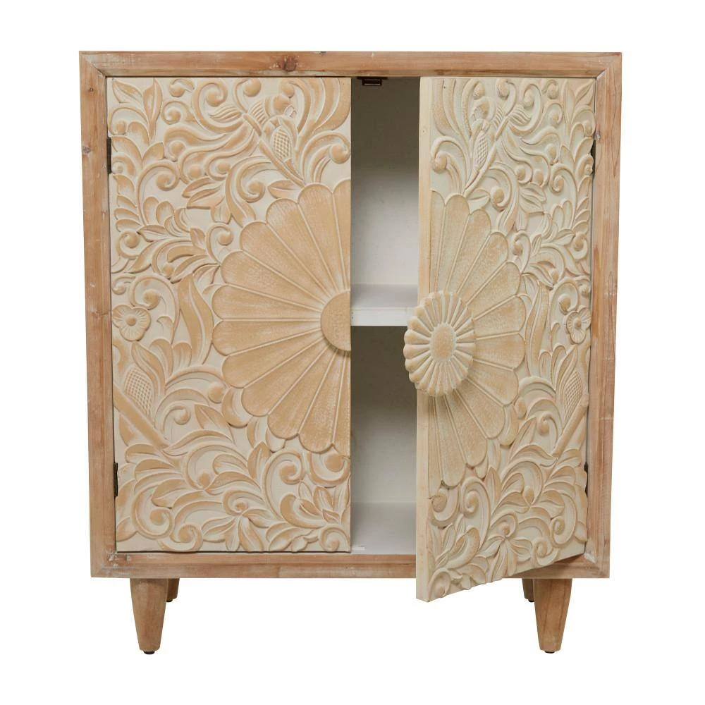 - Wooden storage cabinet features a square shaped body with a rectangular tabletop and a flourish carved cabinet door with a flower-inspired door handle