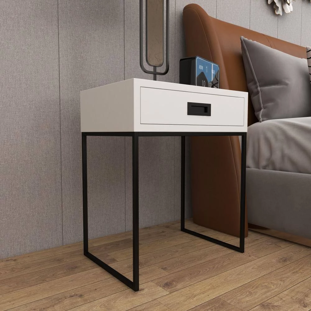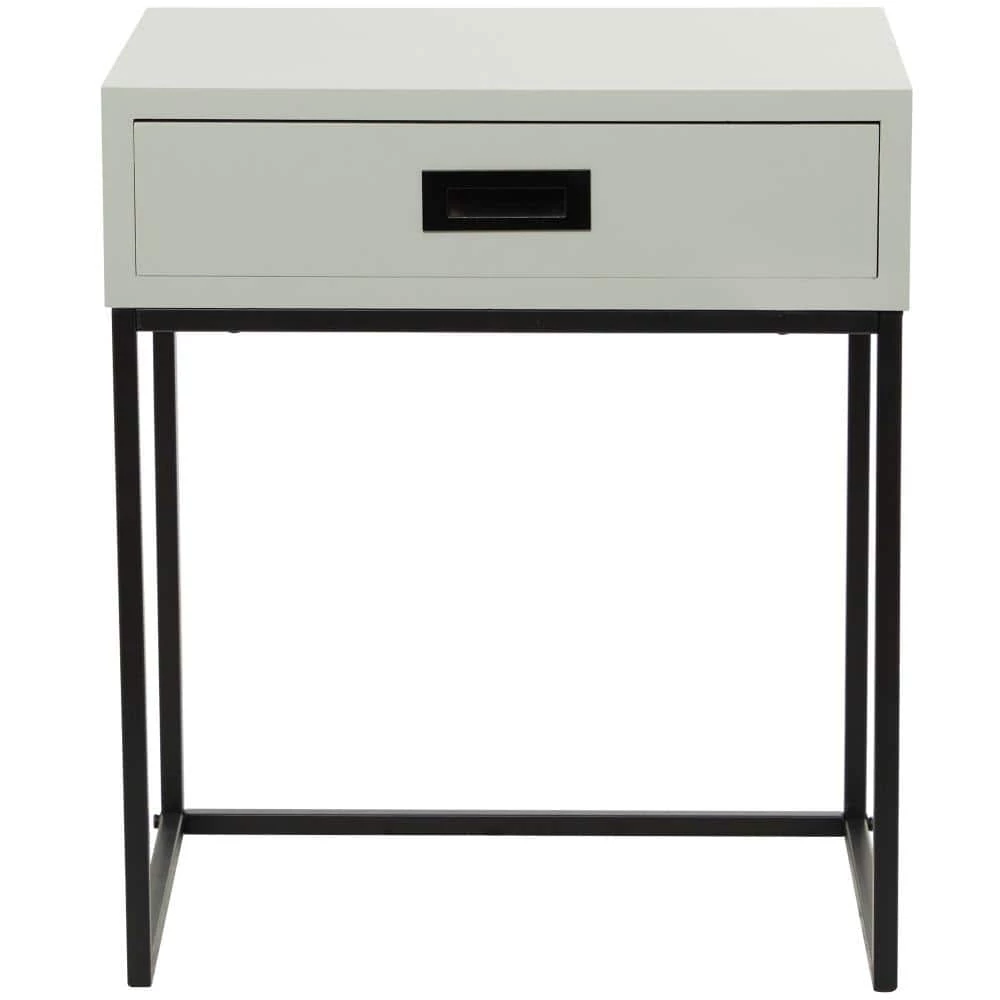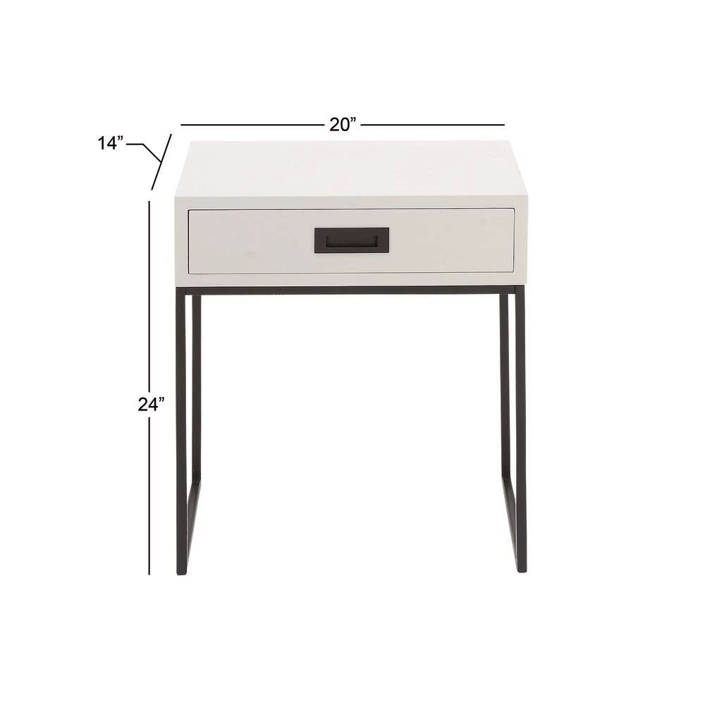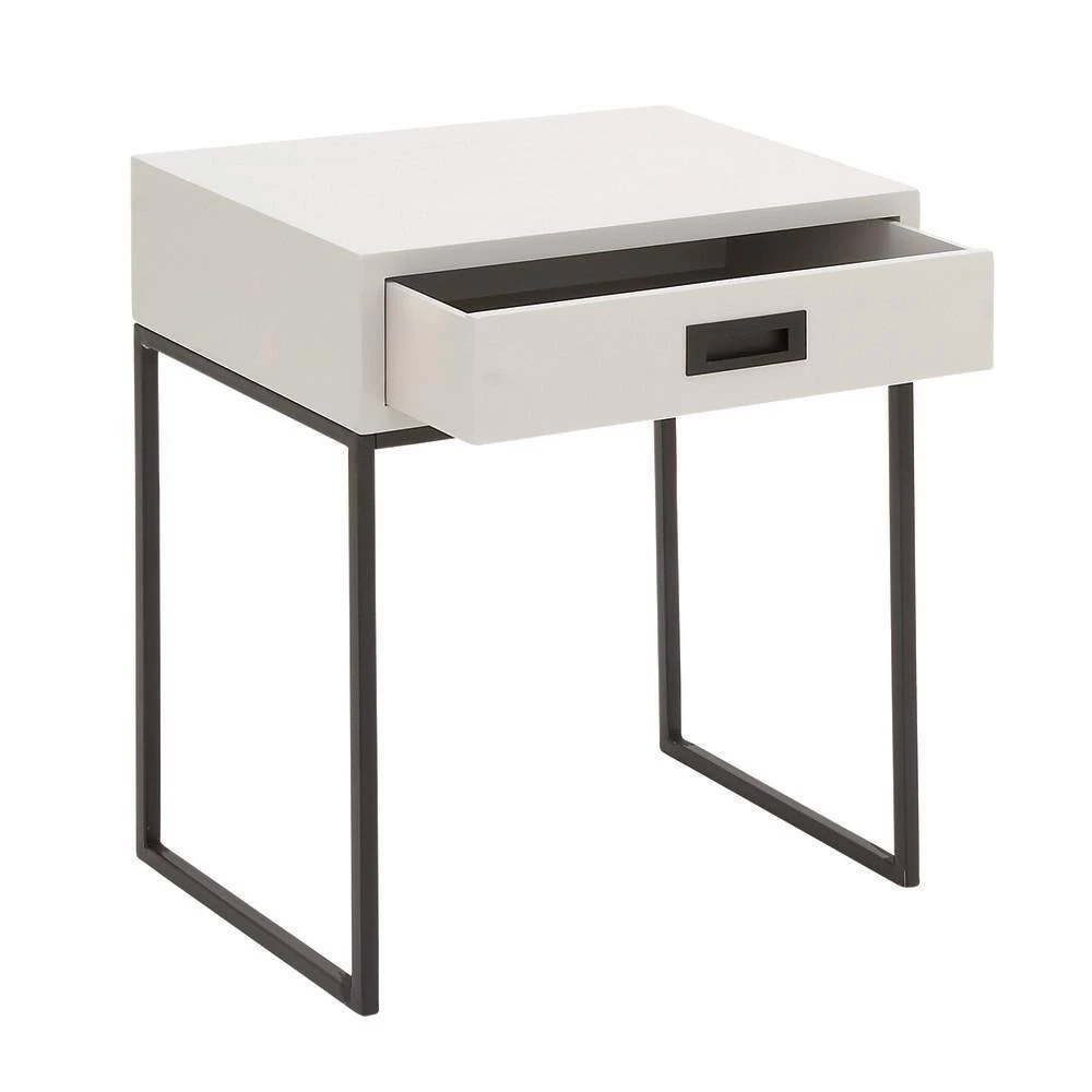 - Contemporary style inspired white pine wood and metal side table features a sleek minimalist design standing on solid metal legs and frame with a convenient wood surface with a built-in drawer