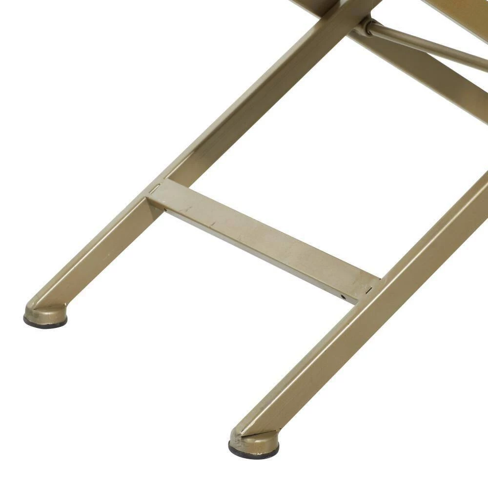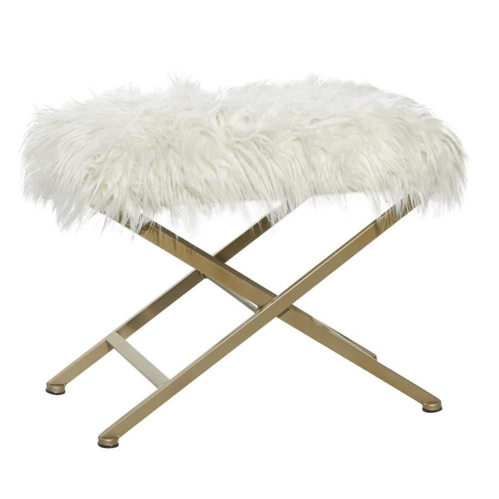 - Rectangular gold vanity stool features a faux fur seat and gold-finished crossbar legs