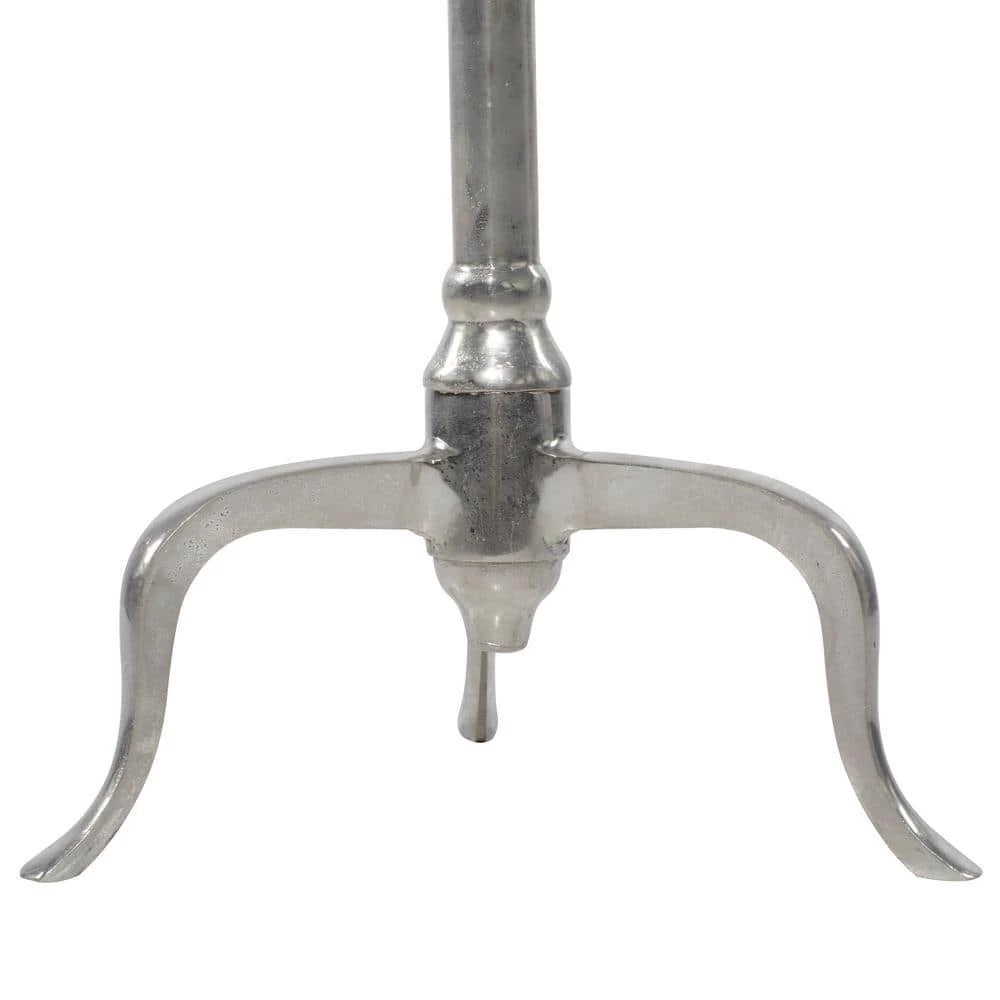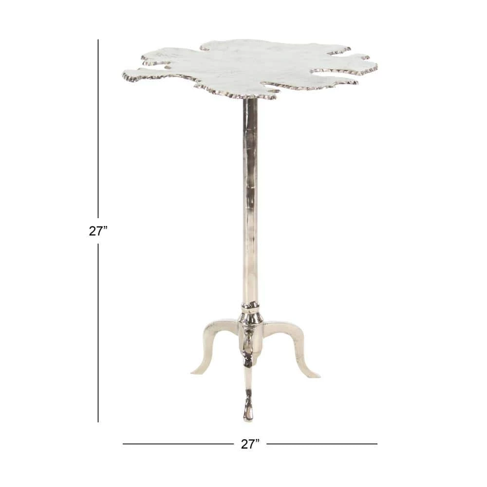 - A silver abstract accent table constructed of robust and shiny aluminum material
