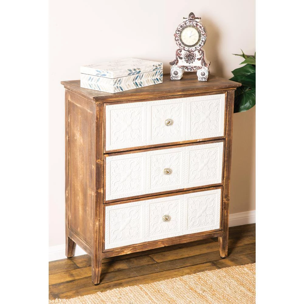 - A farmhouse style three-drawer cabinet made from Chinese fir with a distressed dark brown finish