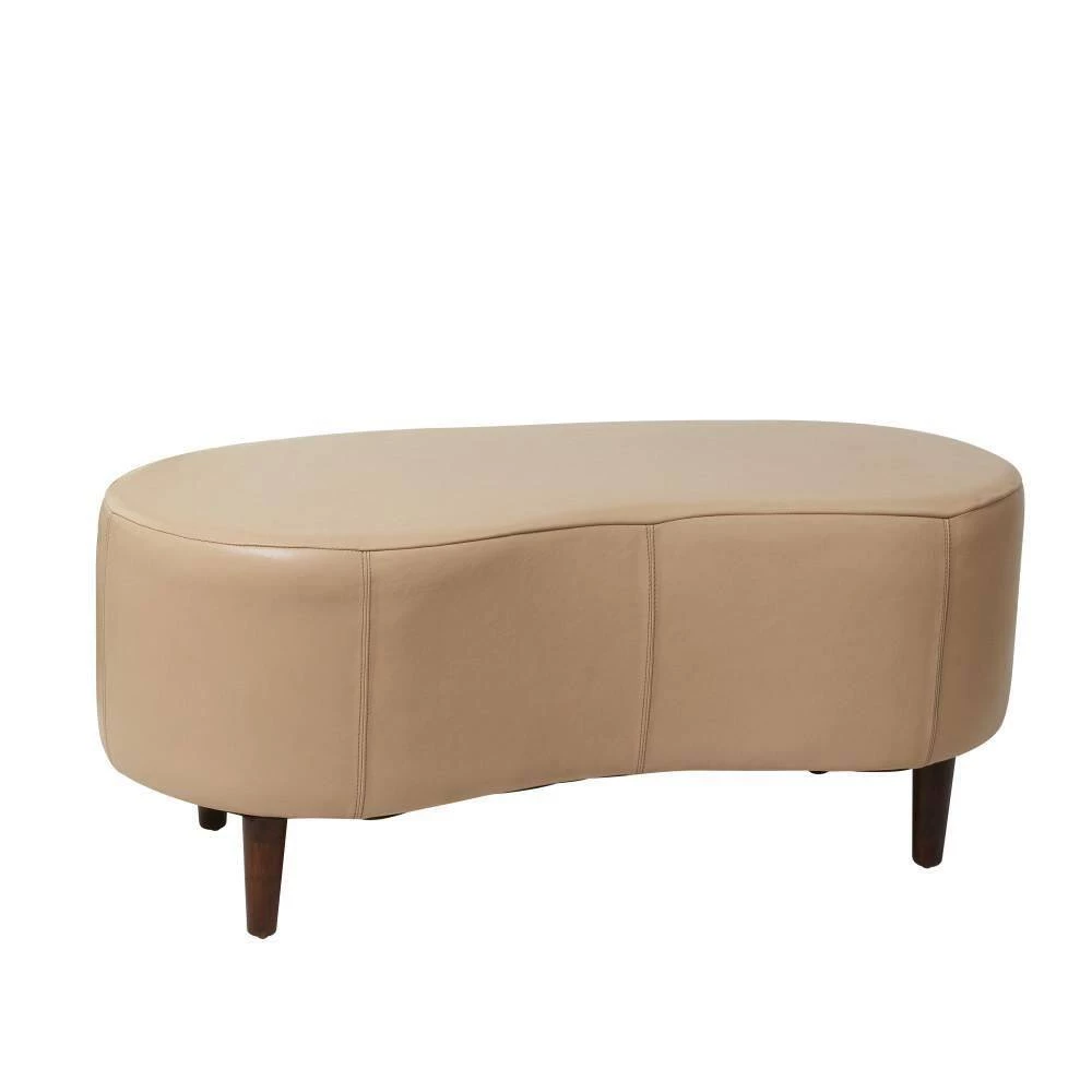 - Tan ottoman showcases a low-profile design with soft upholstered leather on tapered wooden legs, and features a curved structure that will add a dramatic form in any space