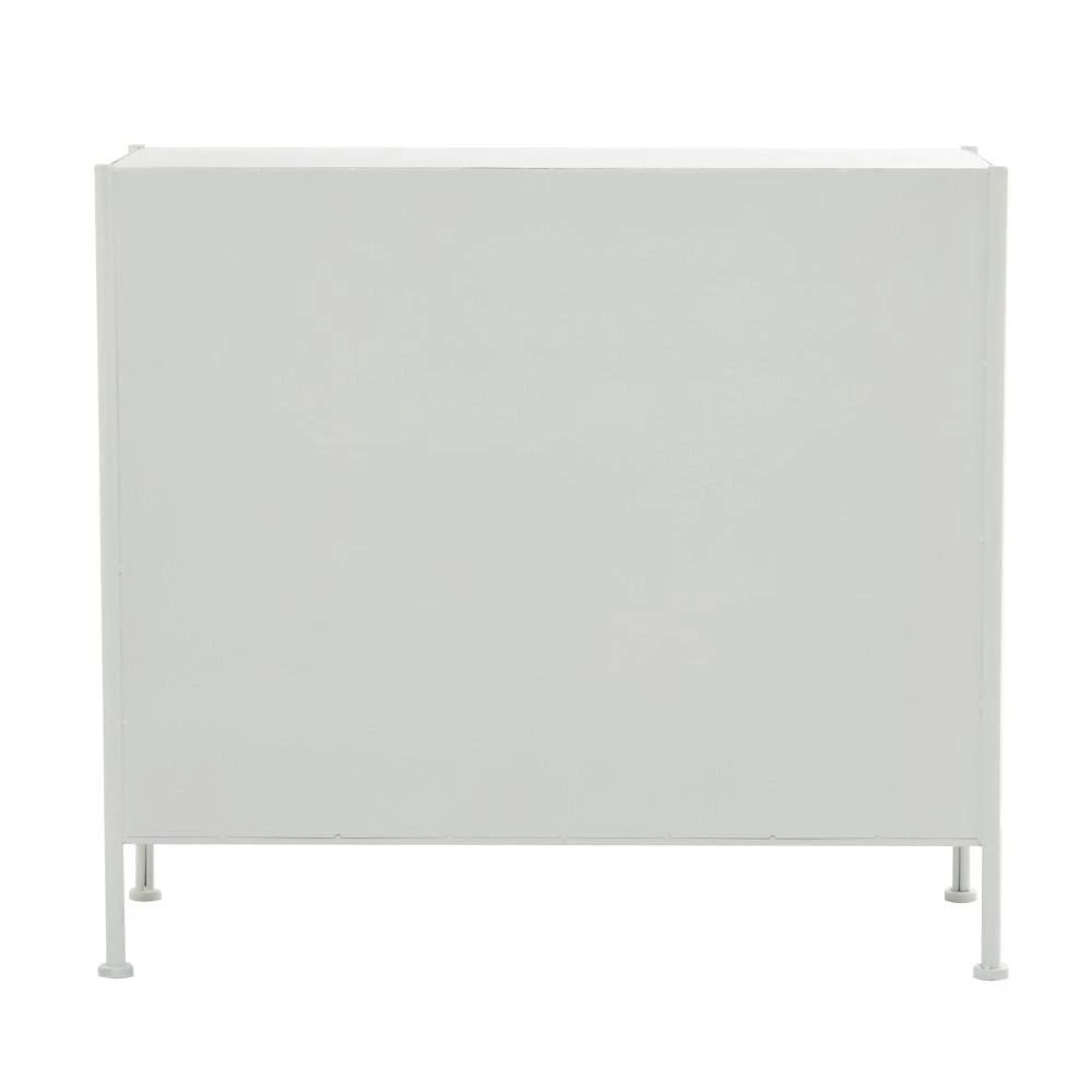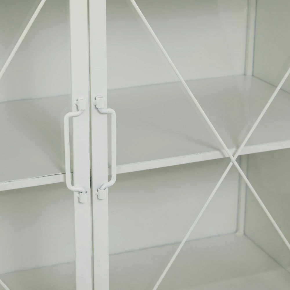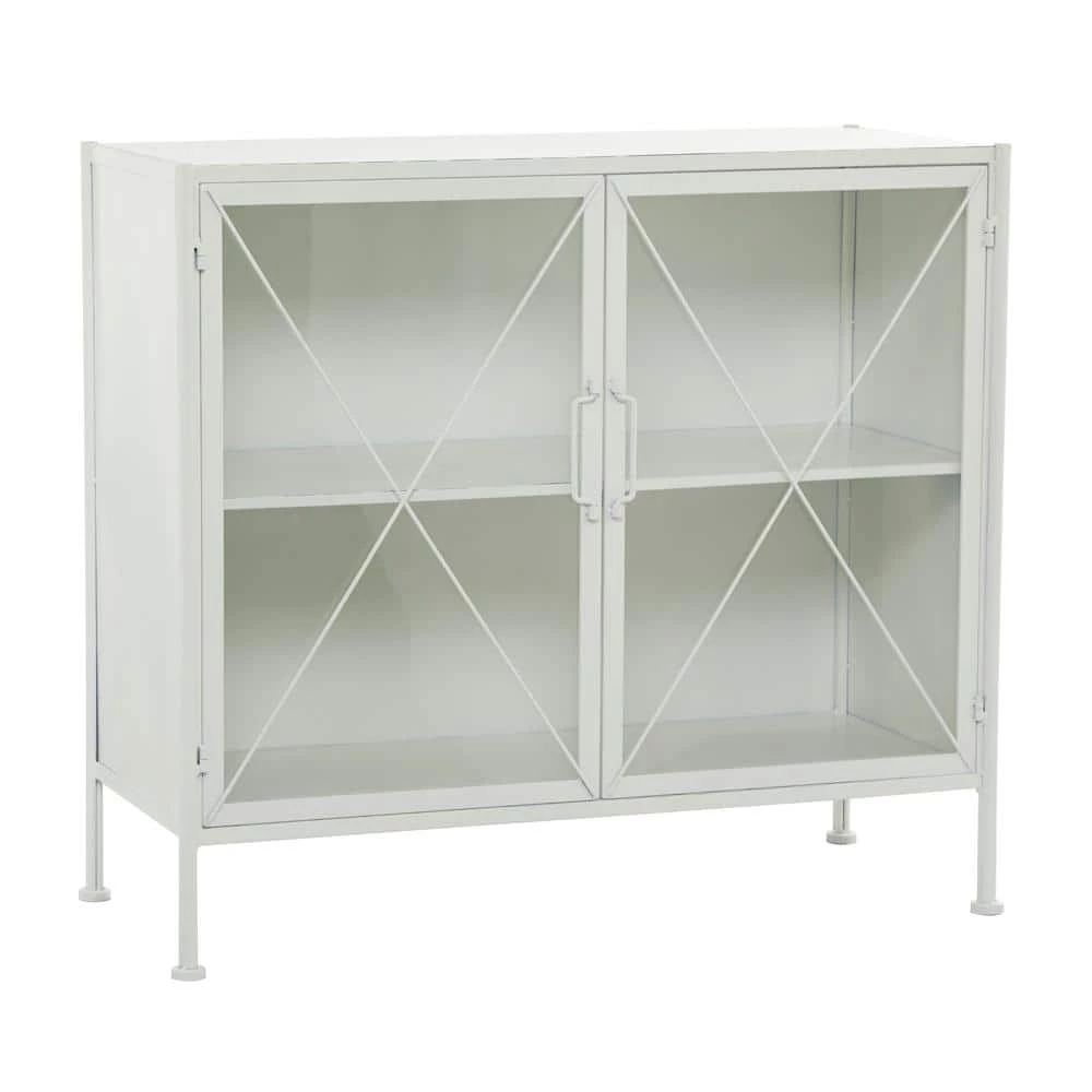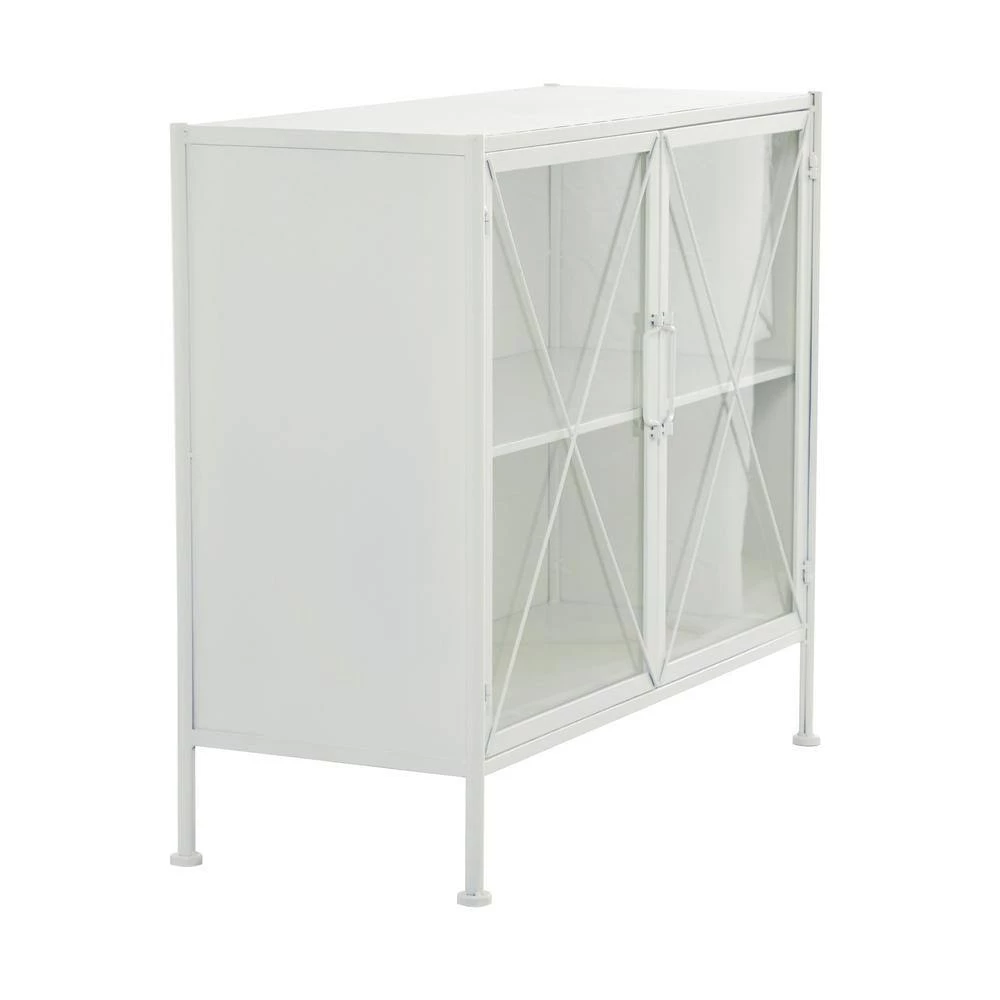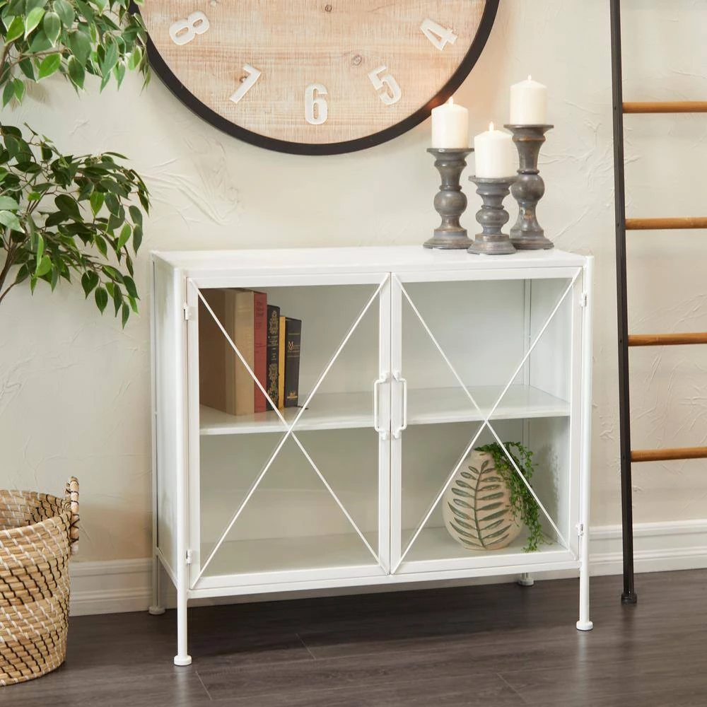 - This 2-door decorative cabinet with spacious storage features a rectangular structure furnished with a smooth white finish and x-shaped metal accents and supported by 4 slim legs with non-slip feet