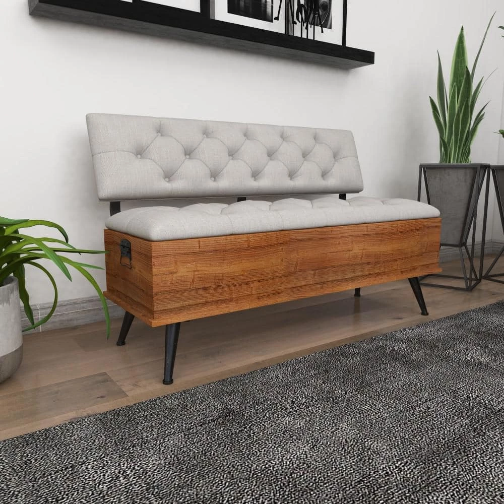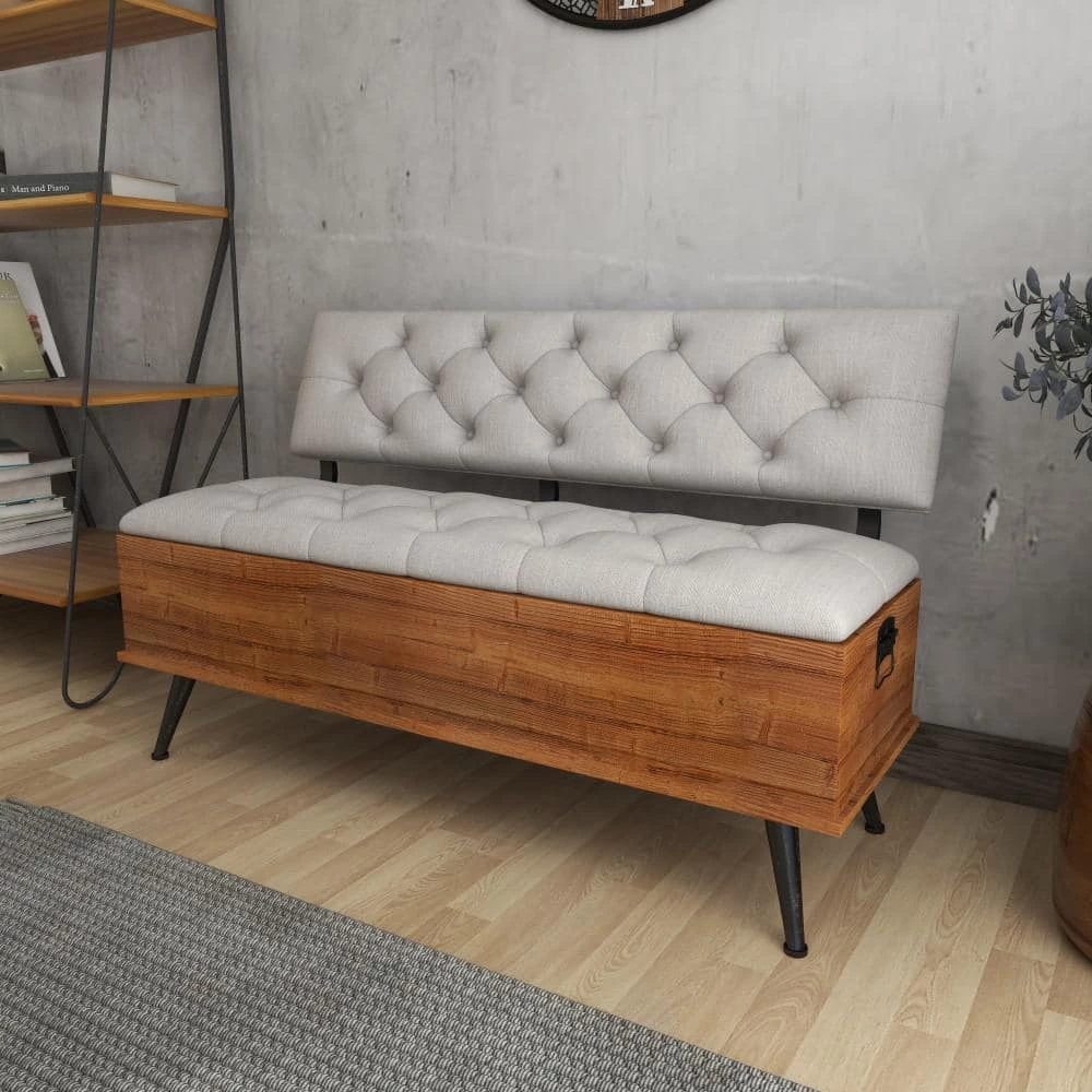 Rectangular storage bench will complement light upholstered sofa with other wood decor for the perfect rustic look. This item ships in 1 carton. Indoor bench with storage has a padded seat and backrest that is securely covered by tufting and added metal studs. Wipe clean with a dry cloth. The seat features a wooden storage area underneath. Suitable for indoor use only. Some assembly required. Wooden storage bench can support up to 250 lbs. Wood bench can accommodate 2 people. Industrial style.