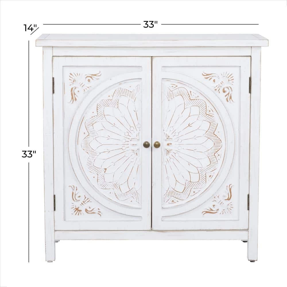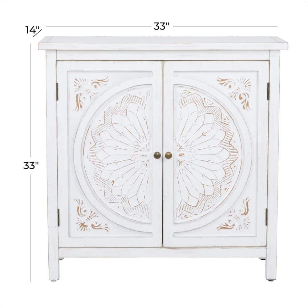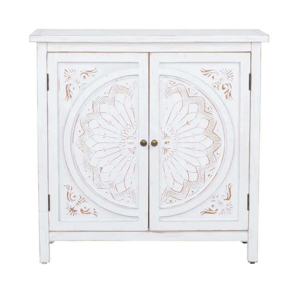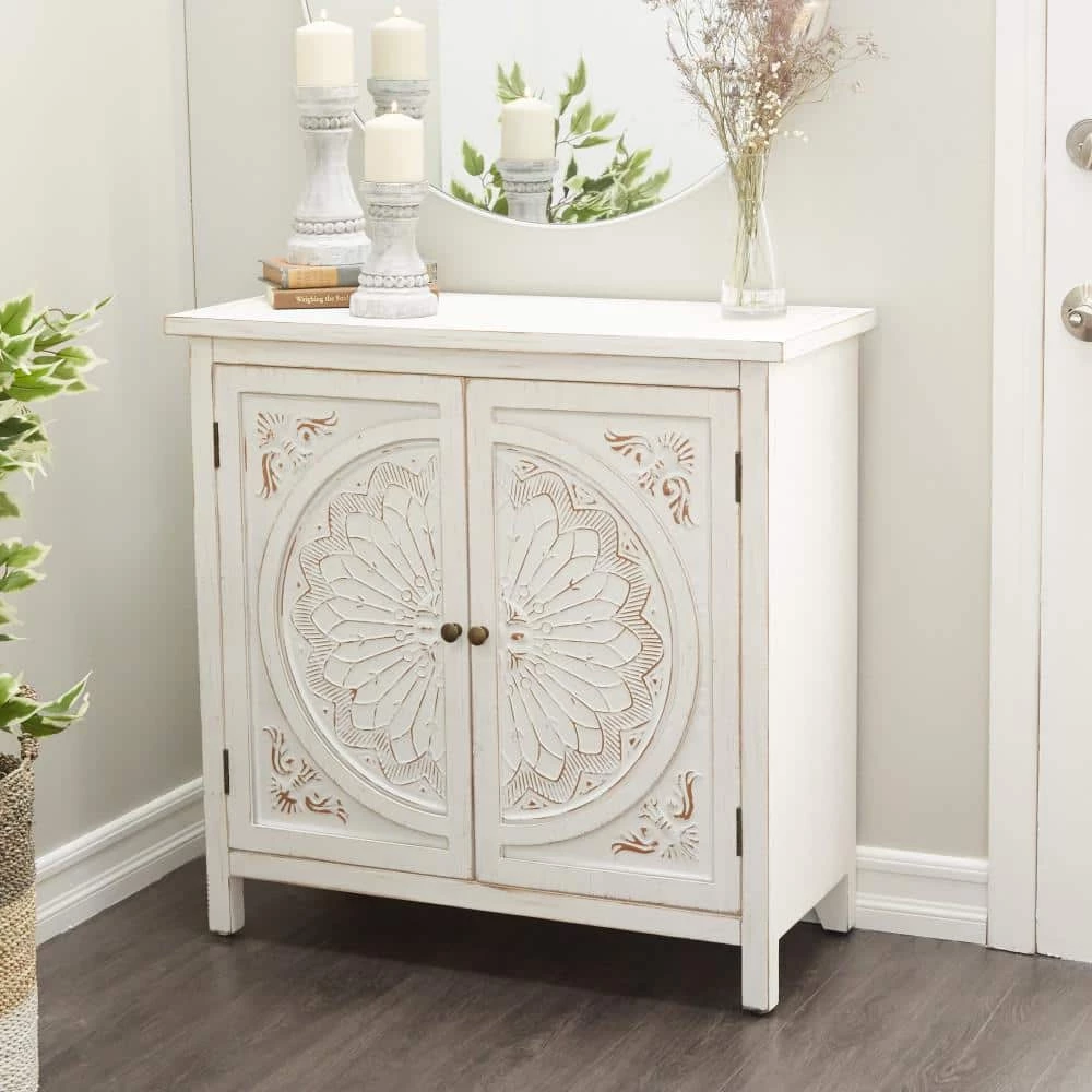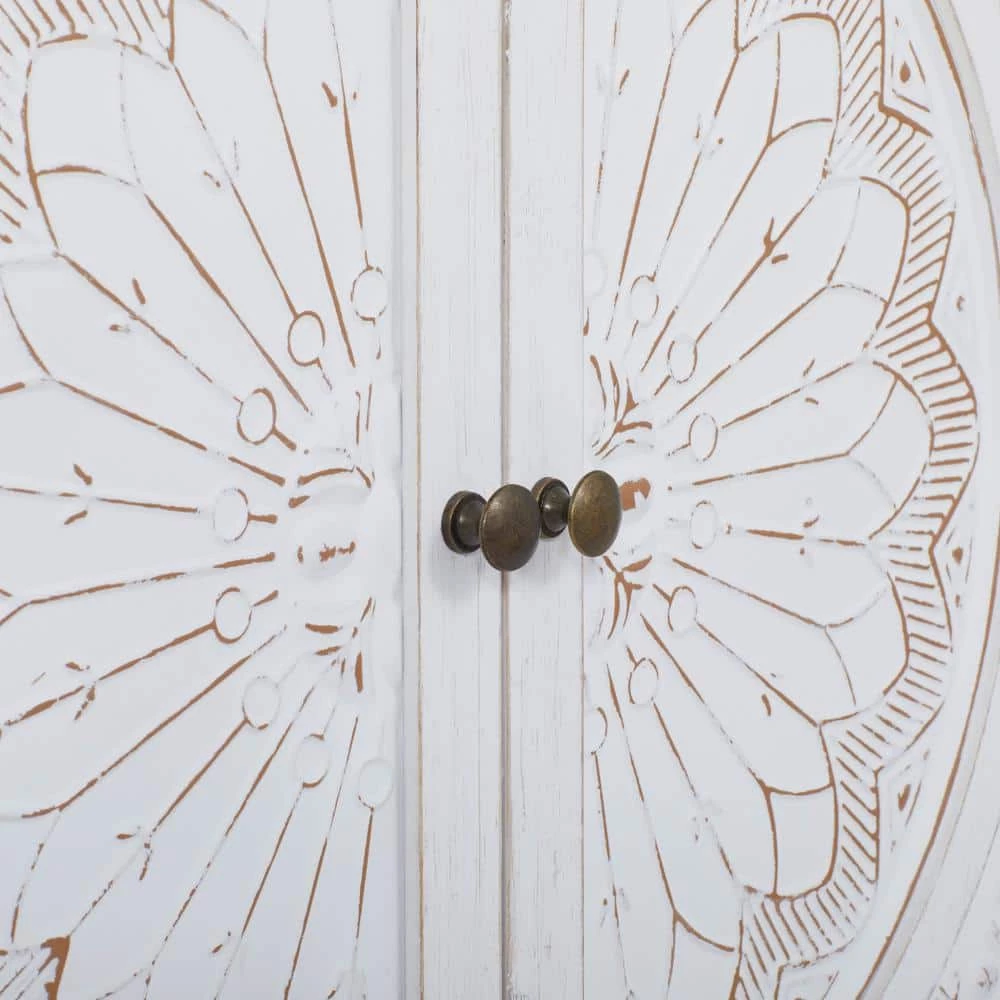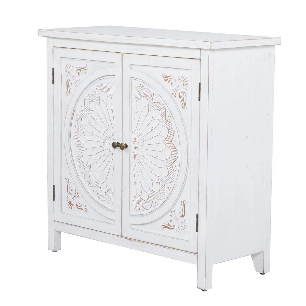 - This distressed white accent cabinet highlights a rectangular structure with round handles and mandala pattern
