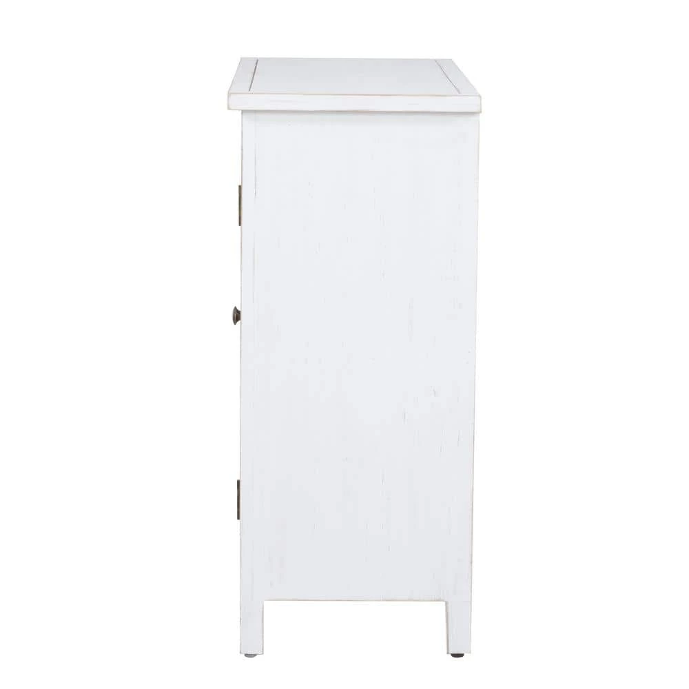 - This farmhouse accent cabinet features distressed white finish that goes well with neutral-colored interior